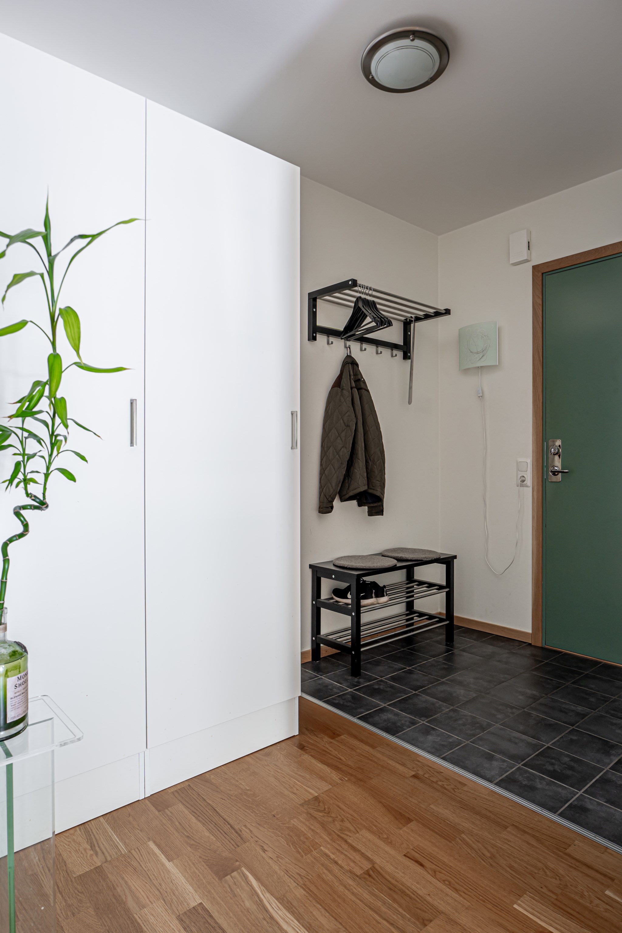 Välkommen in i hallen med klinker på golvet och garderober för klädförvaring.