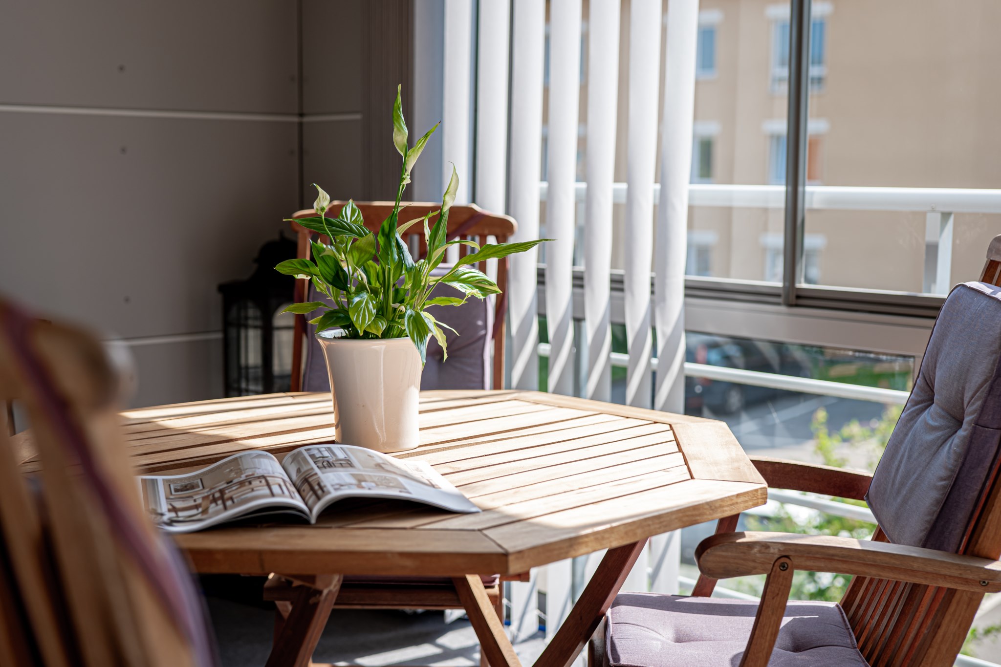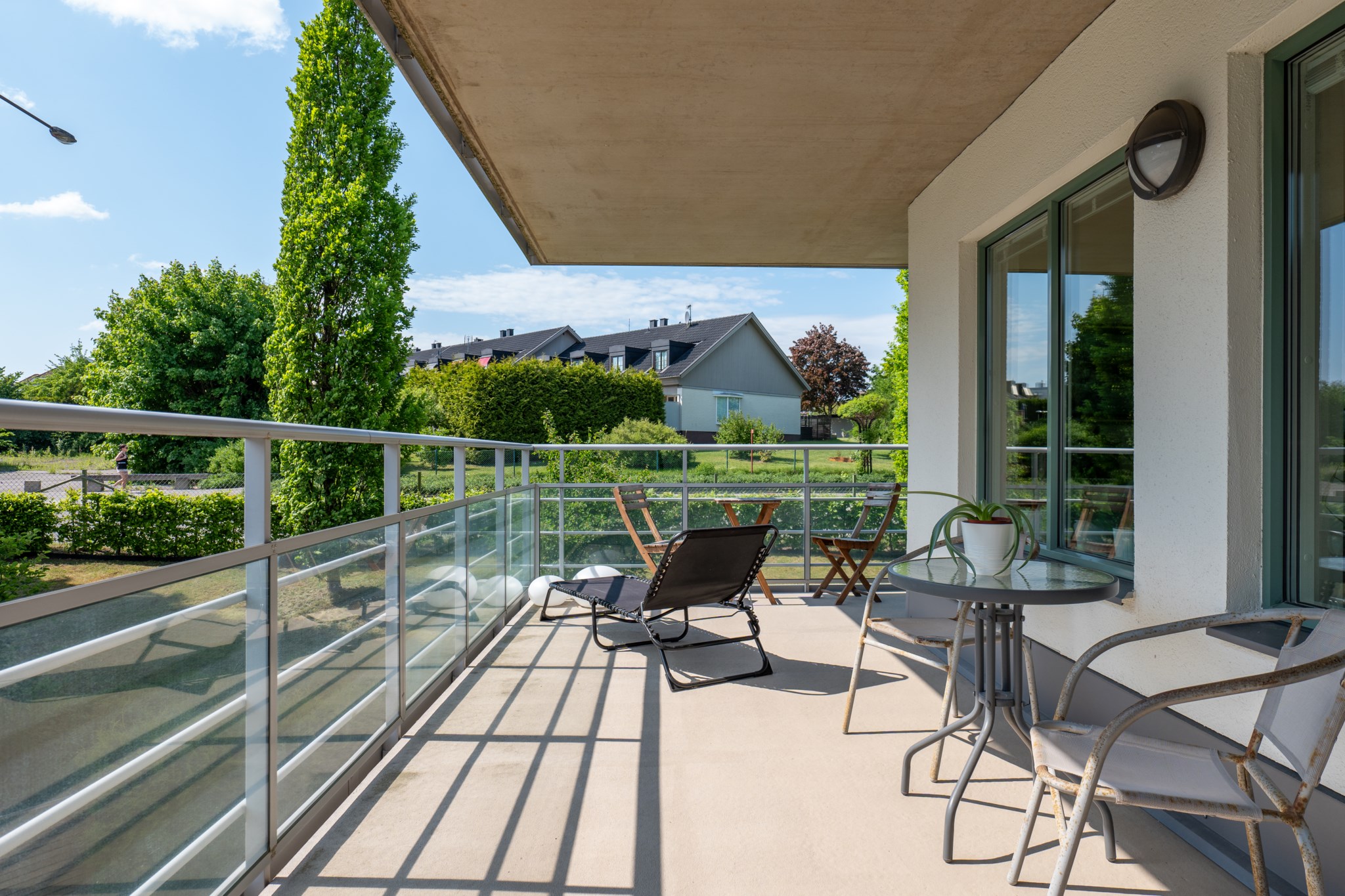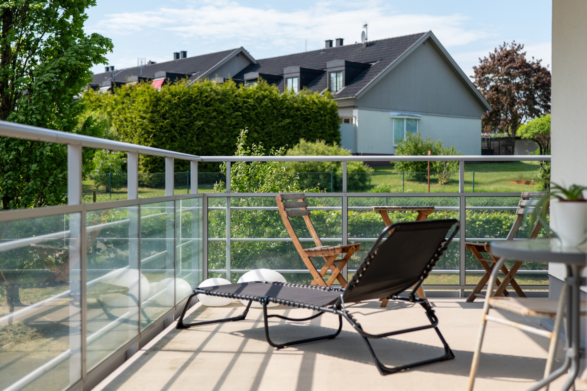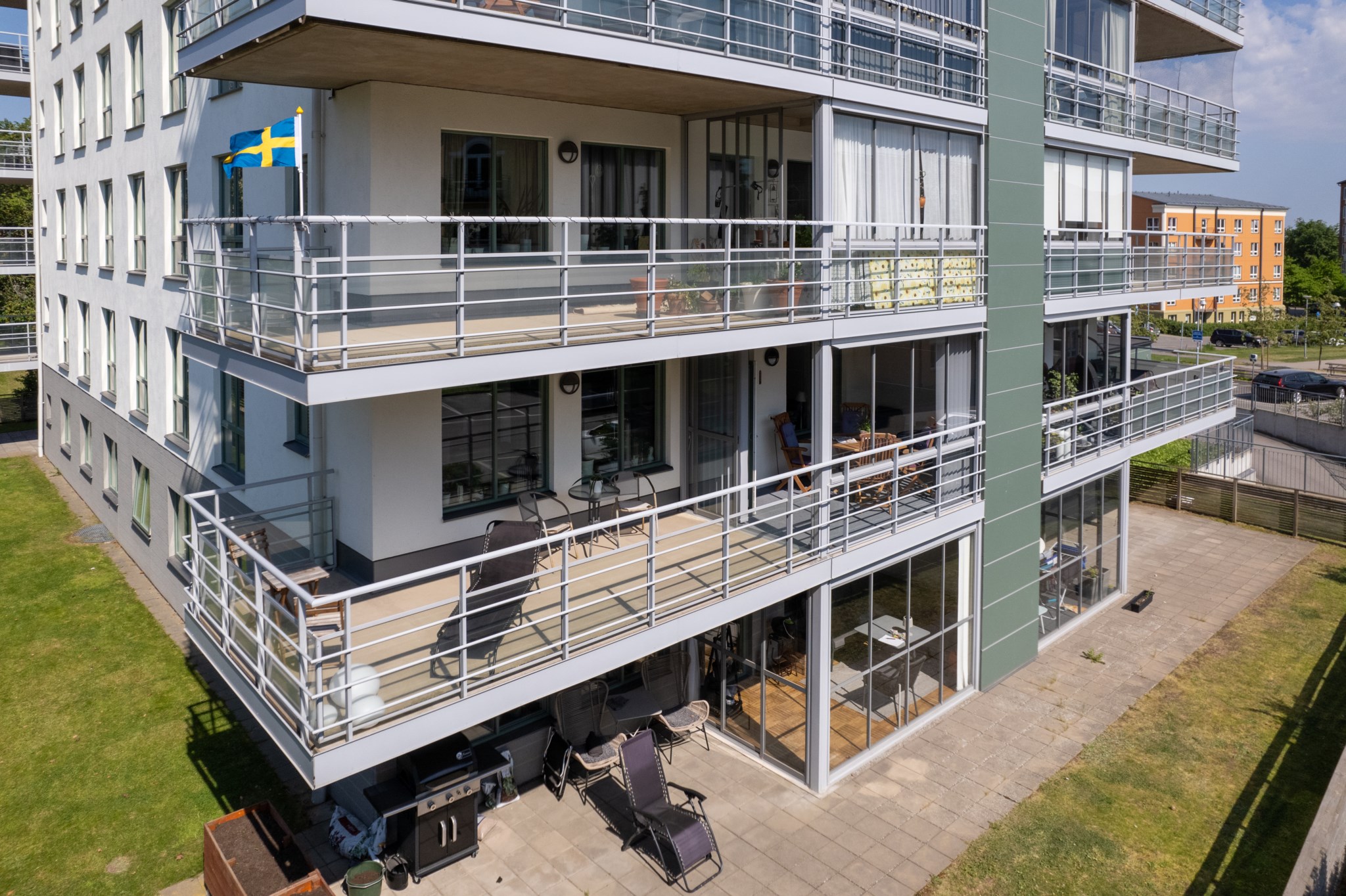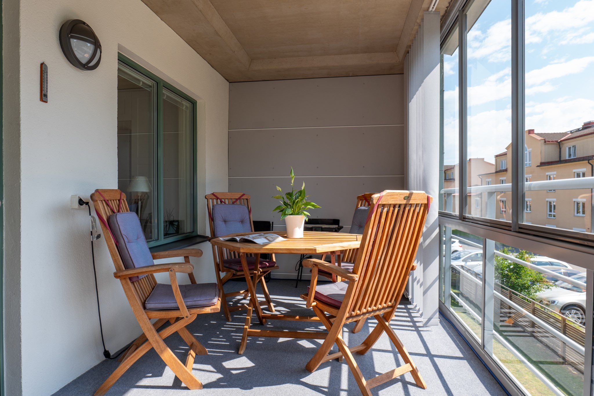 Balkong i söderläge med både en väl tilltagen inglasad del samt ett utvändigt utrymme med gott om plats för solsäng samt sittgrupp.
