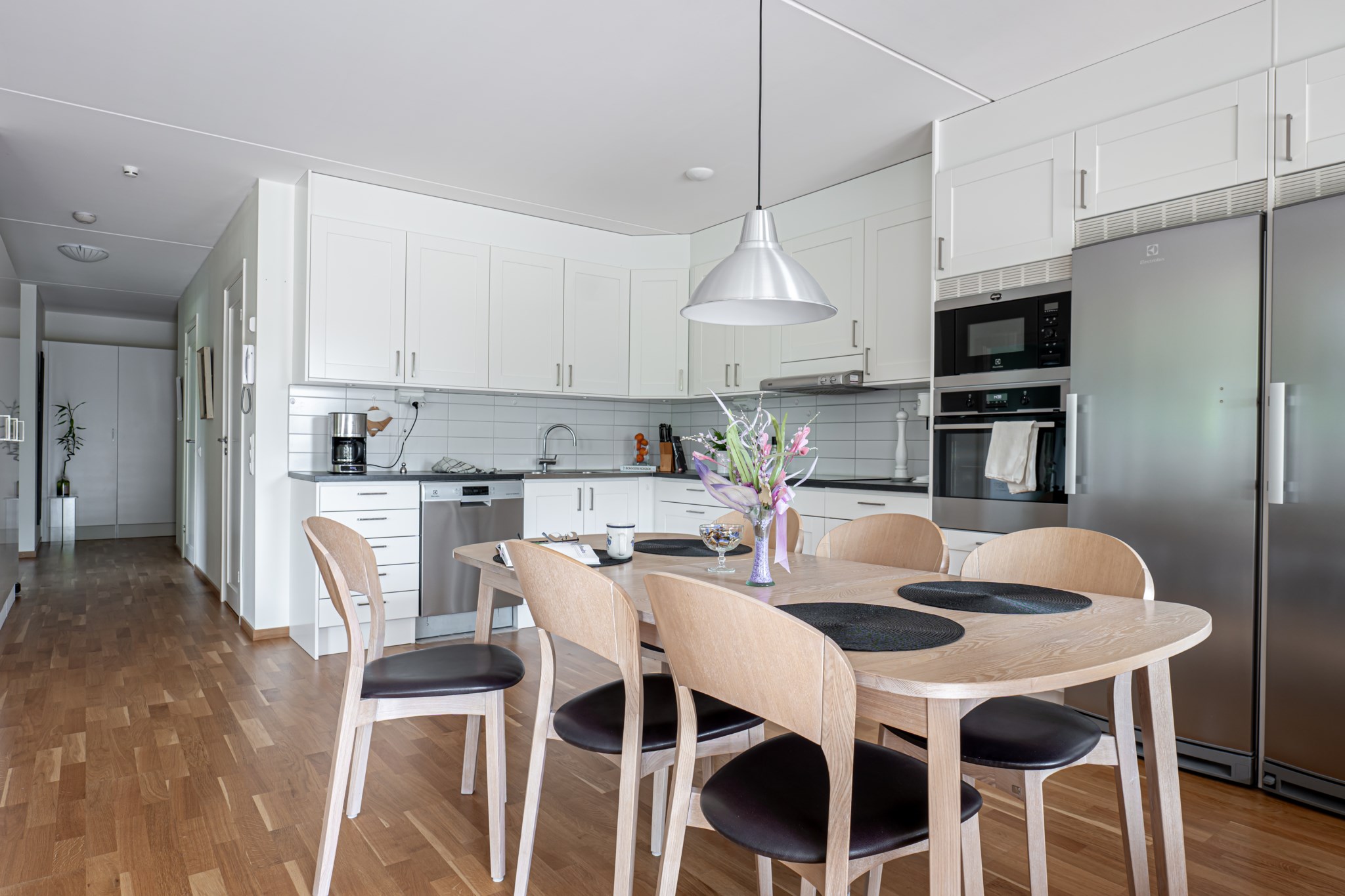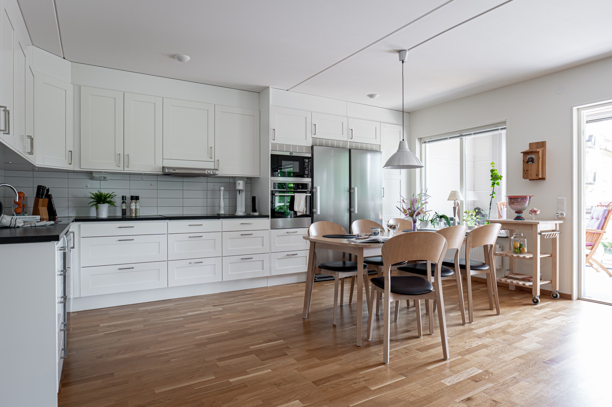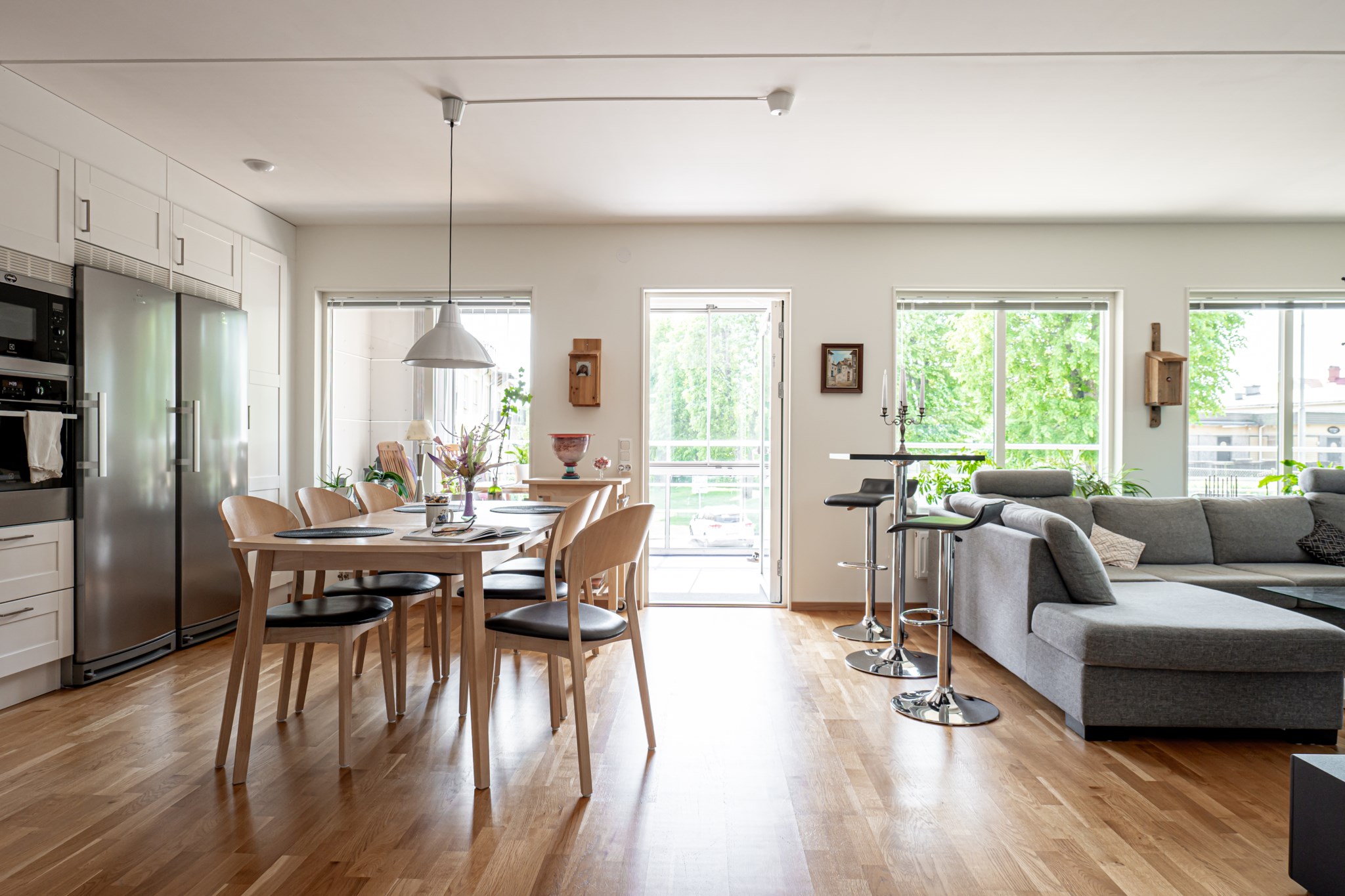 Kök och vardagsrum i öppen social planlösning som ger en inbjudande miljö att vistas i. Köket är ifrån Vedum med flertalet uppgraderingar gjorda vid inflyttning som bland annat utdragbara lådor, ramluckor och uppgraderade vitvaror med rostfria maskiner. Ifrån köket nås balkongen.