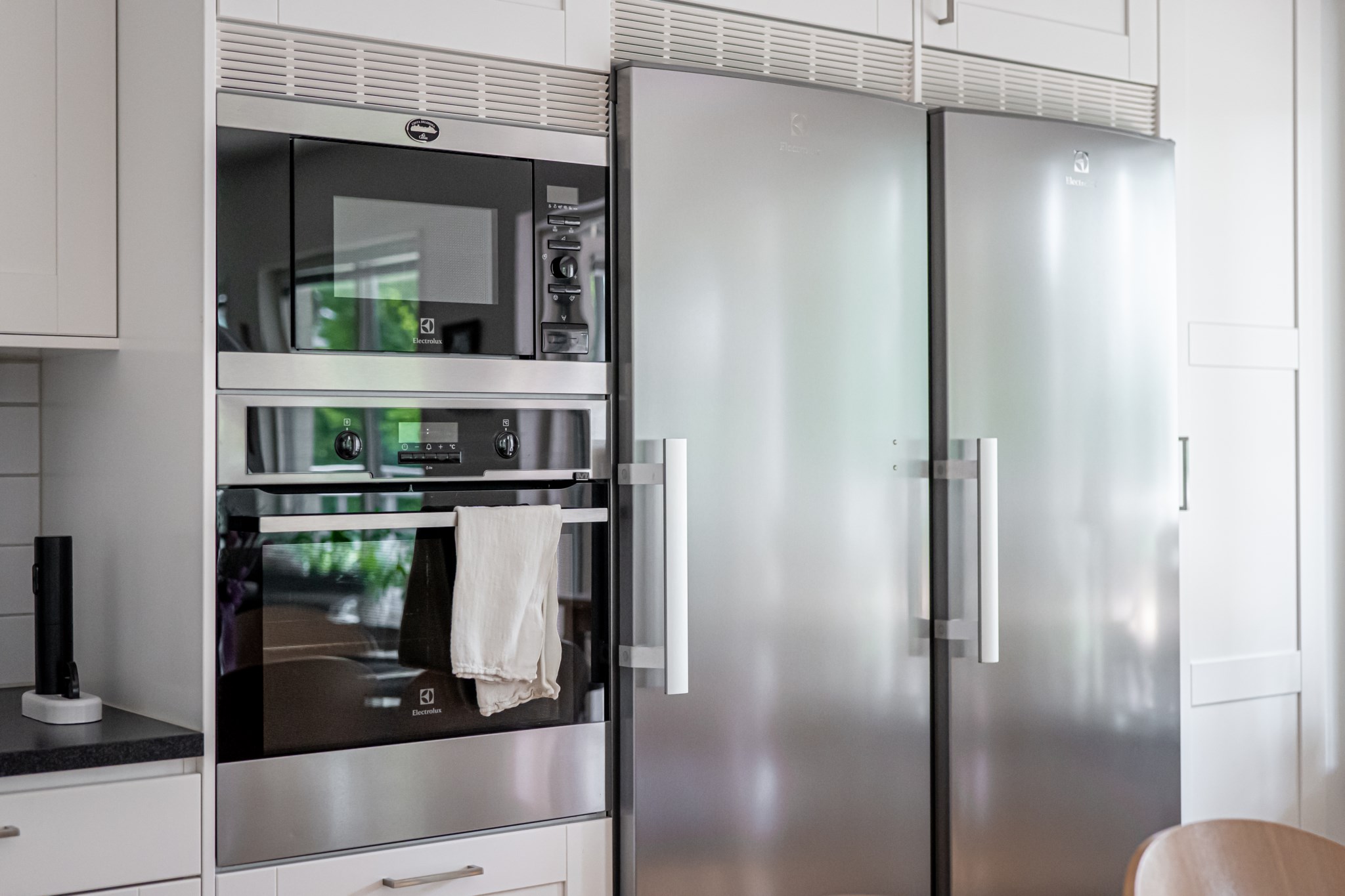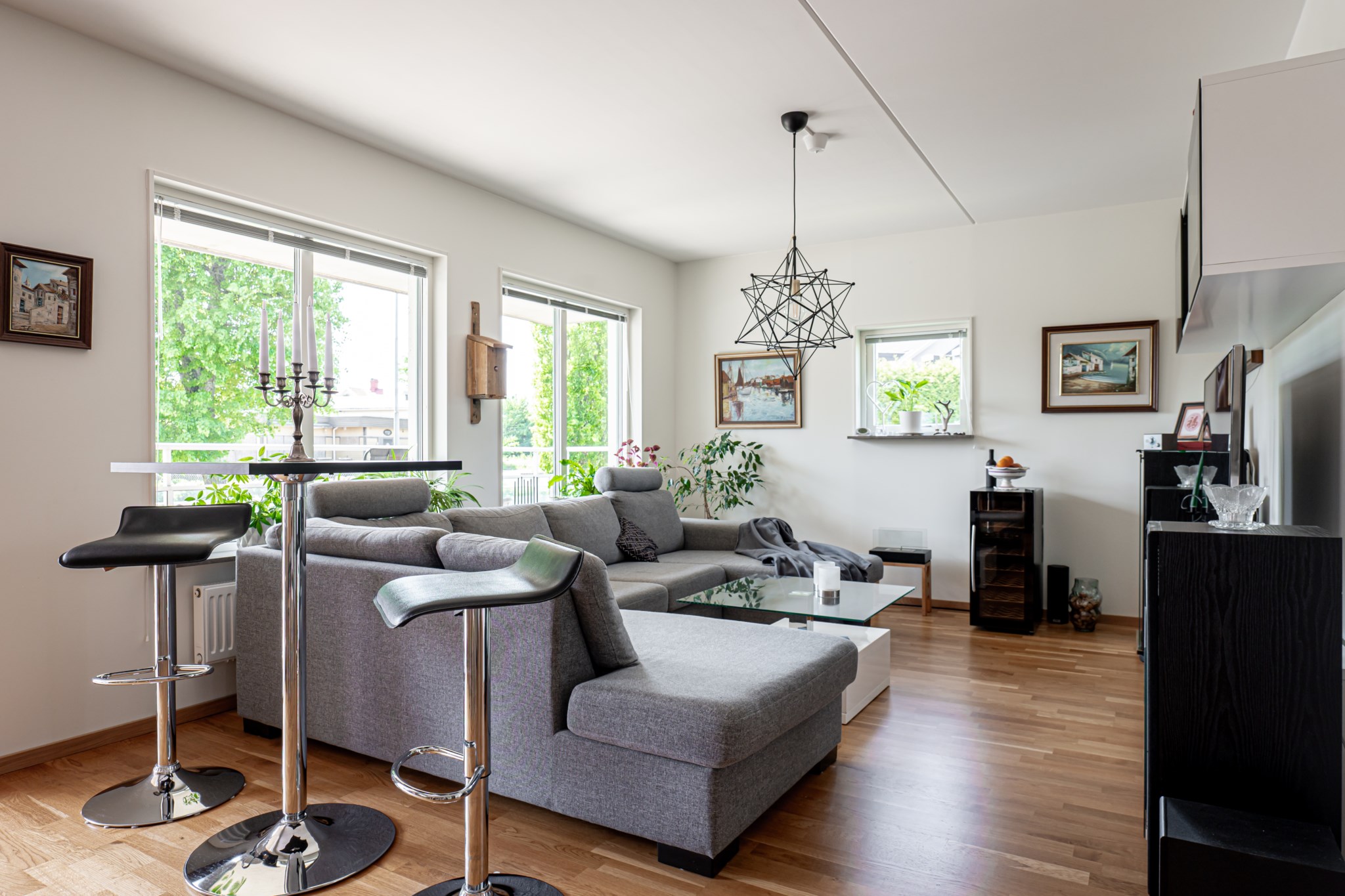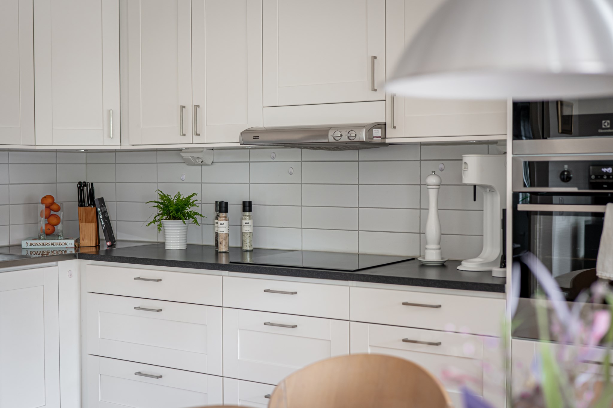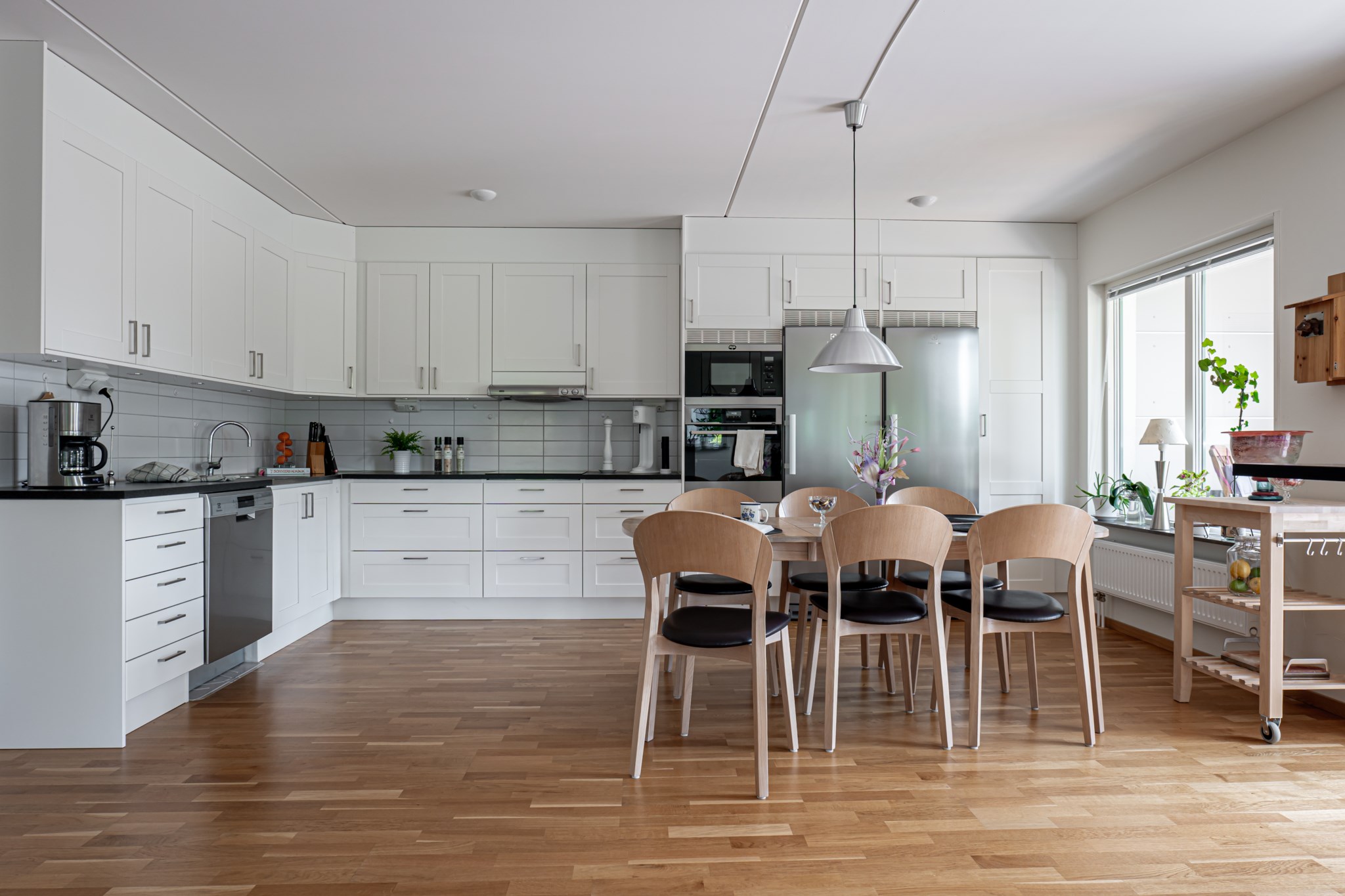 Kök och vardagsrum i öppen social planlösning som ger en inbjudande miljö att vistas i. Köket är ifrån Vedum med flertalet uppgraderingar gjorda vid inflyttning som bland annat utdragbara lådor, ramluckor och uppgraderade vitvaror med rostfria maskiner. Ifrån köket nås balkongen.