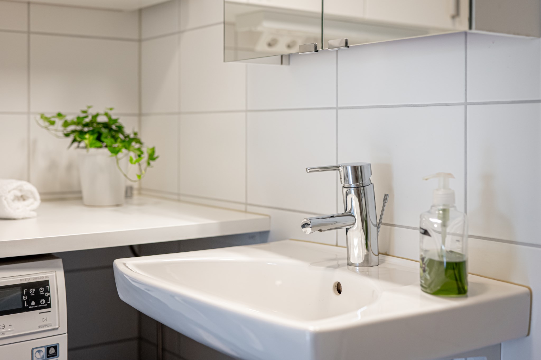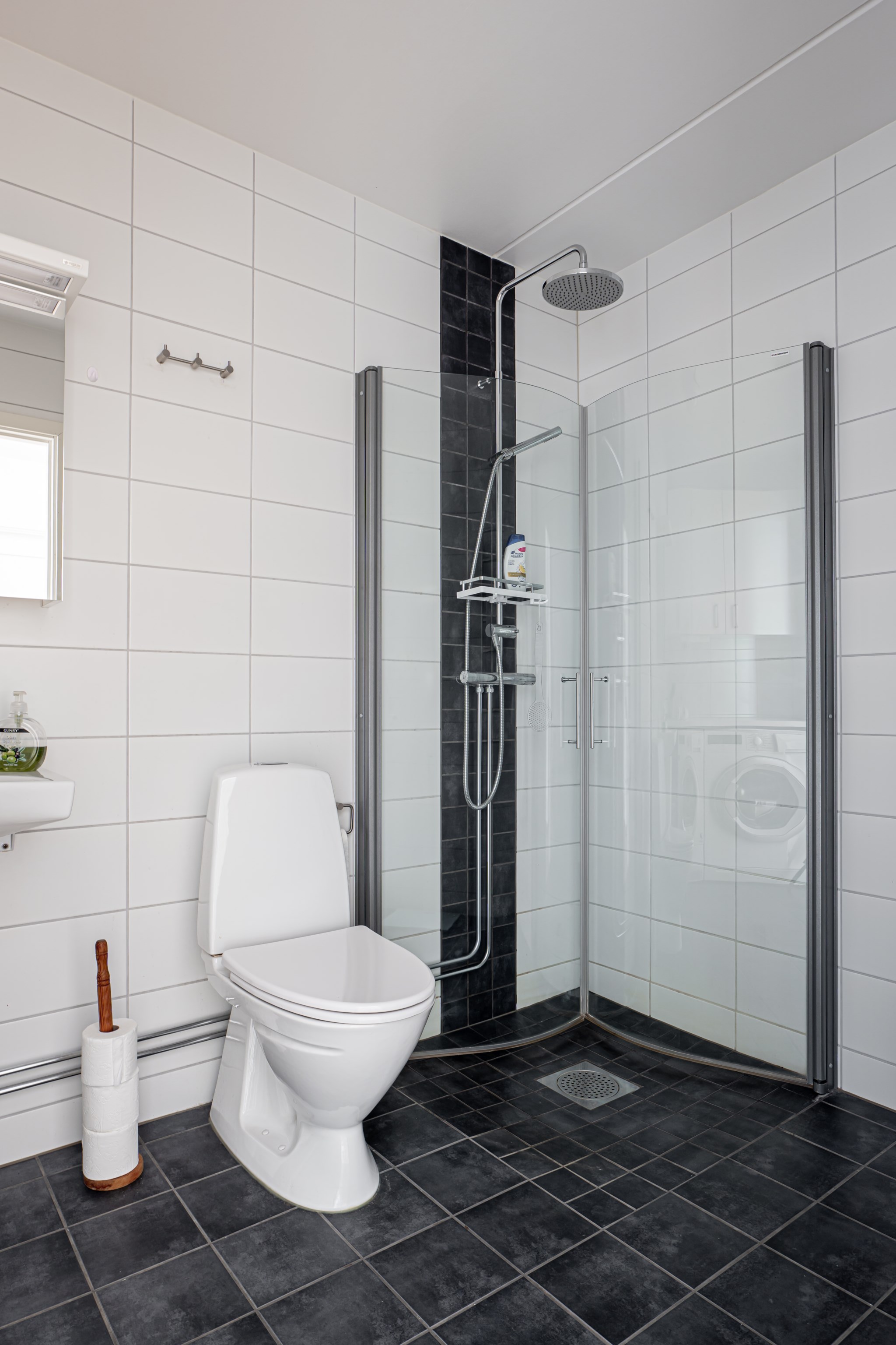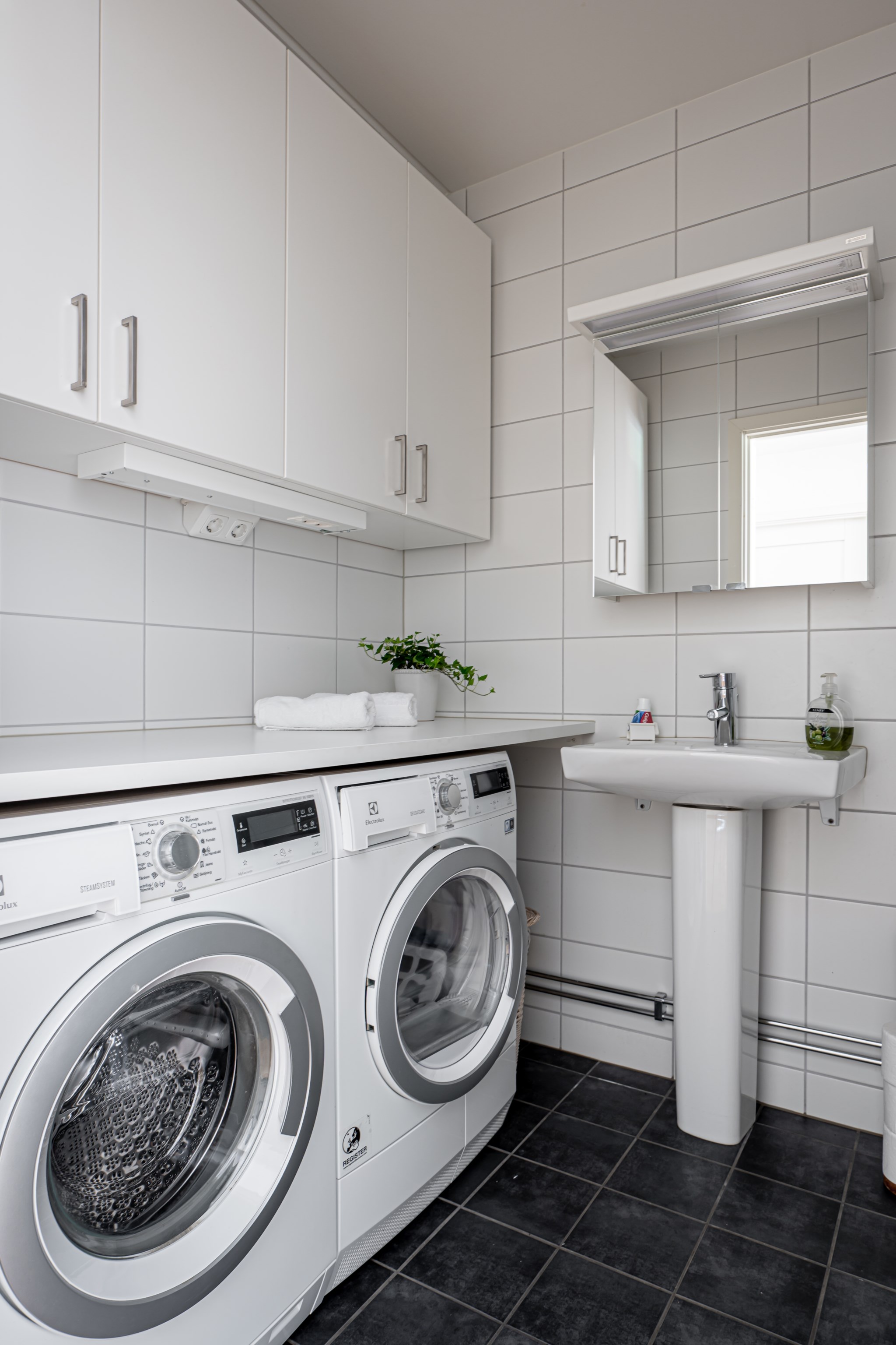 Helkaklat badrum med takdusch och dessutom innehållande tvättmaskin och torktumlare.