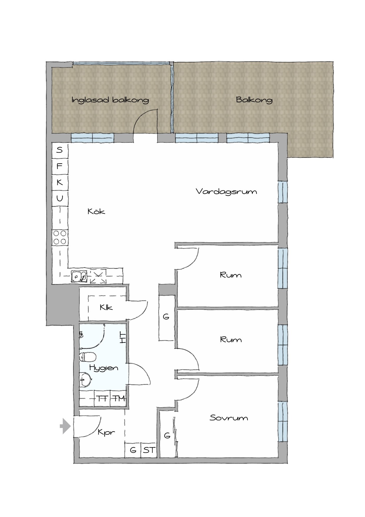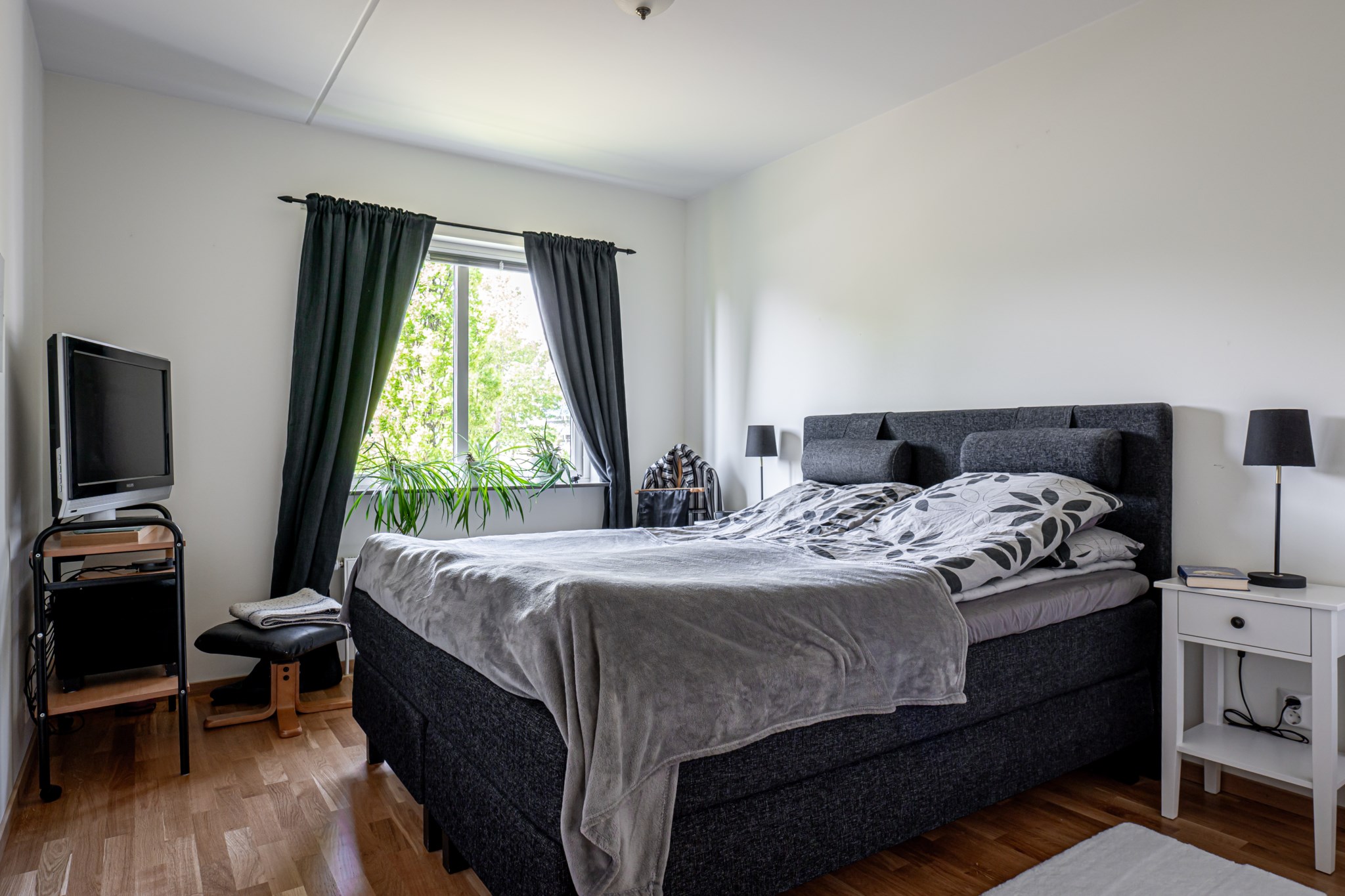 Lägenheten har idag tre sovrum varav ett som är lite större med gott om plats för dubbelsäng. Det större sovrummet har även inbyggd förvaring med skjutdörrar.