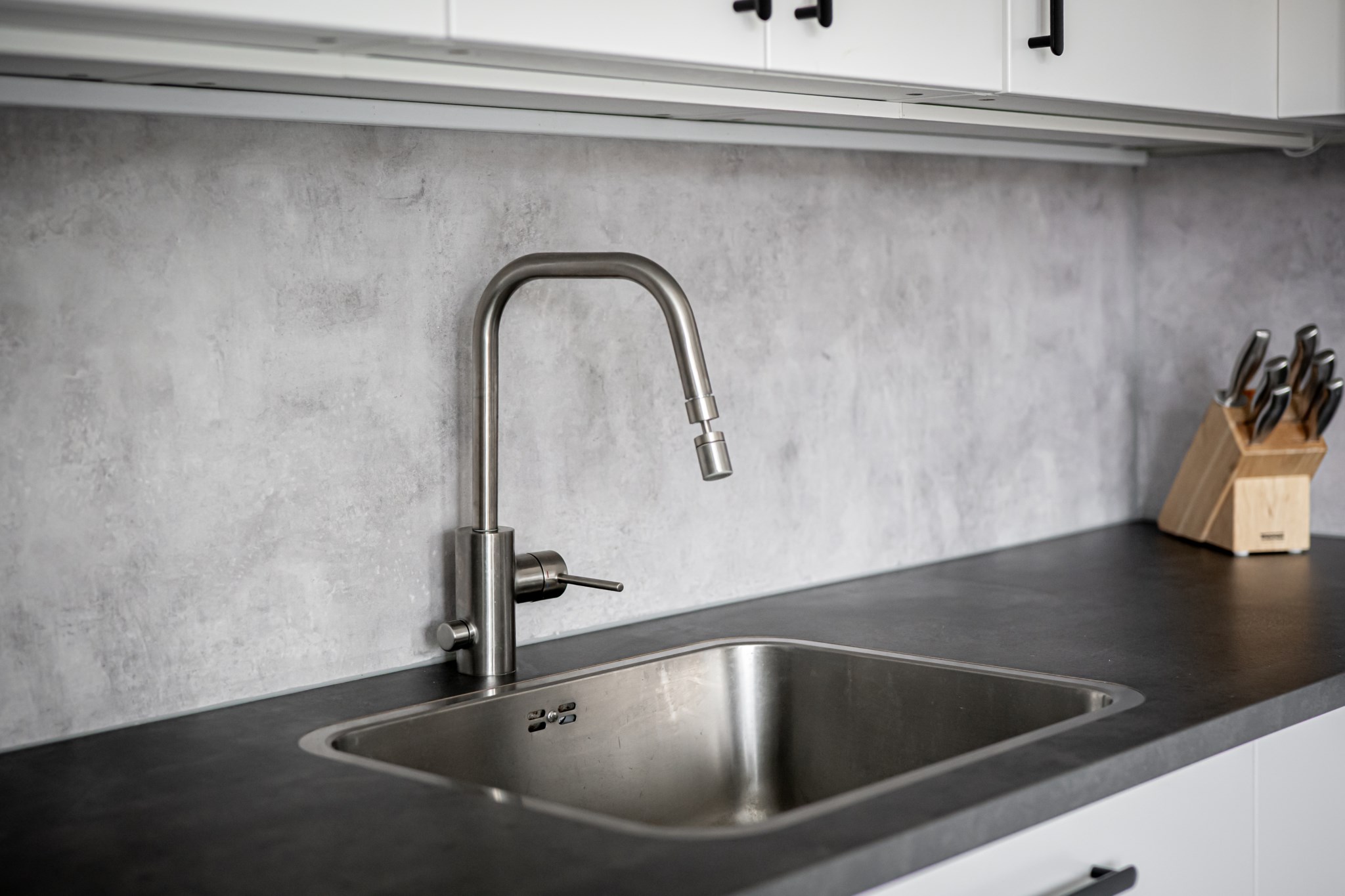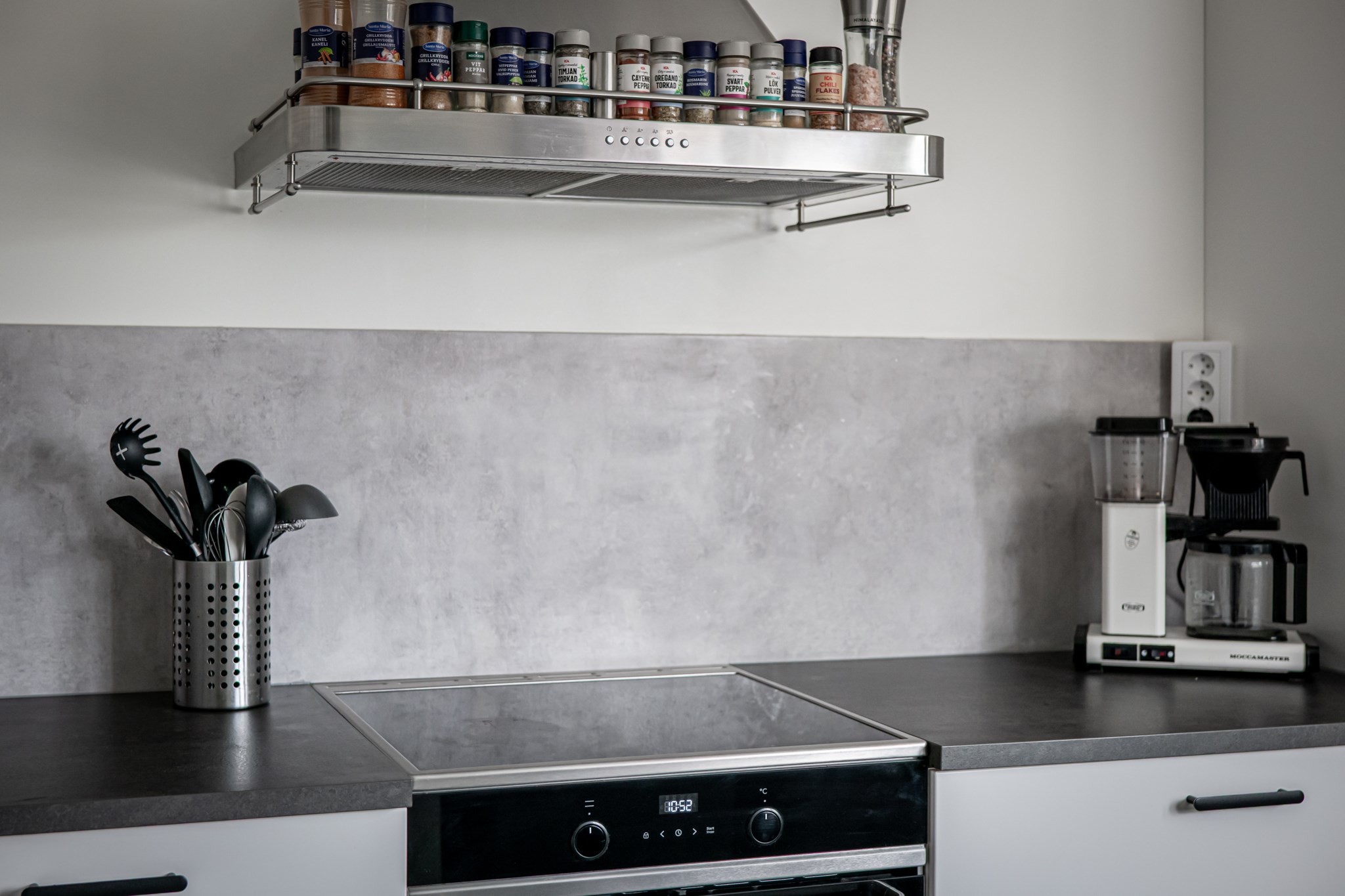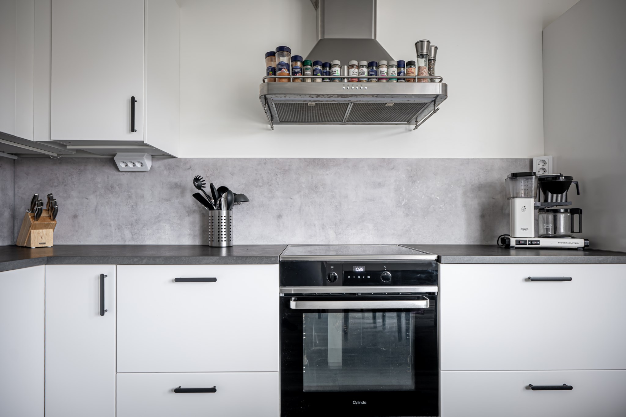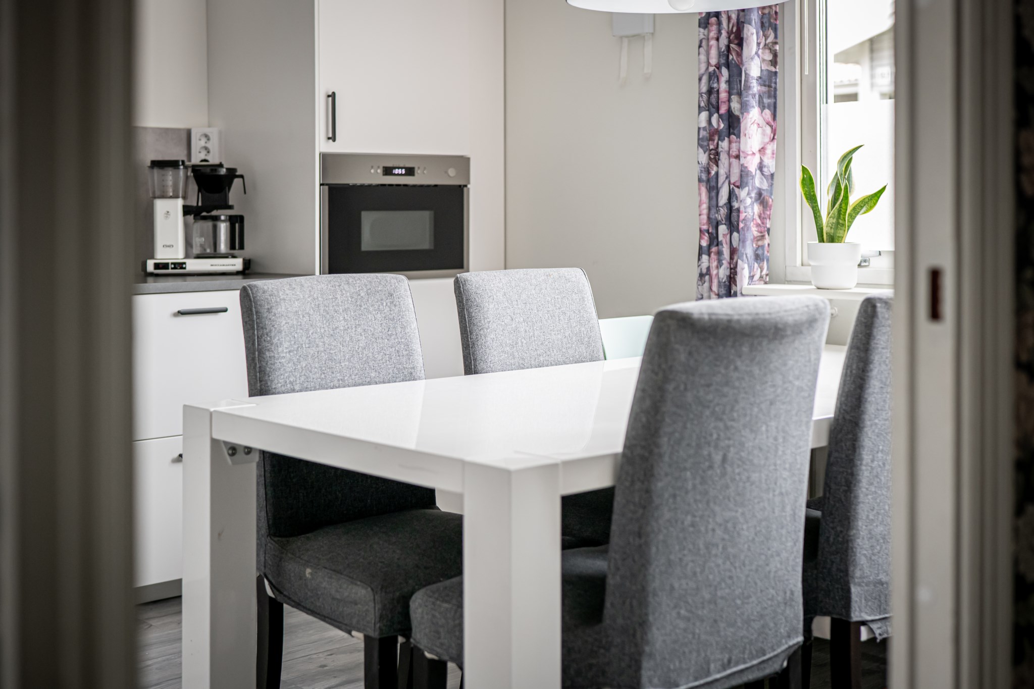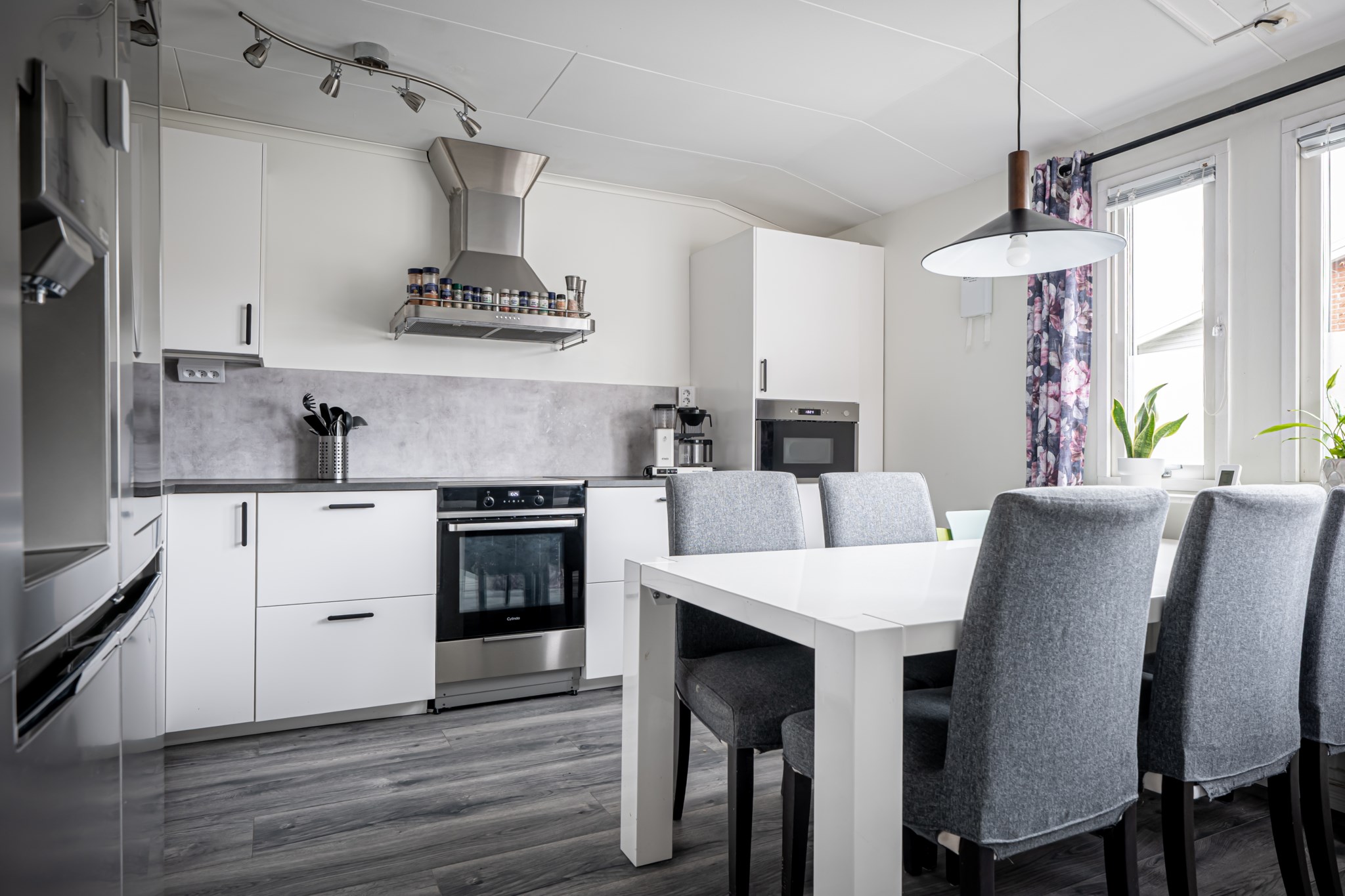 Stilrent och nyrenoverat kök från 2024 med vita luckor, grå bänkskivor och matchande stänkskydd. Bra förvaring i både över-, underskåp samt generösa arbetsytor kring spis och disk. Utrustat med fullstor kyl/frys i rostfritt med altarskåpsöppning och ismaskin. Diskmaskin, spis/ugn, inbyggd mikro och köksfläkt. Matplats vid fönster för 4–6 personer.