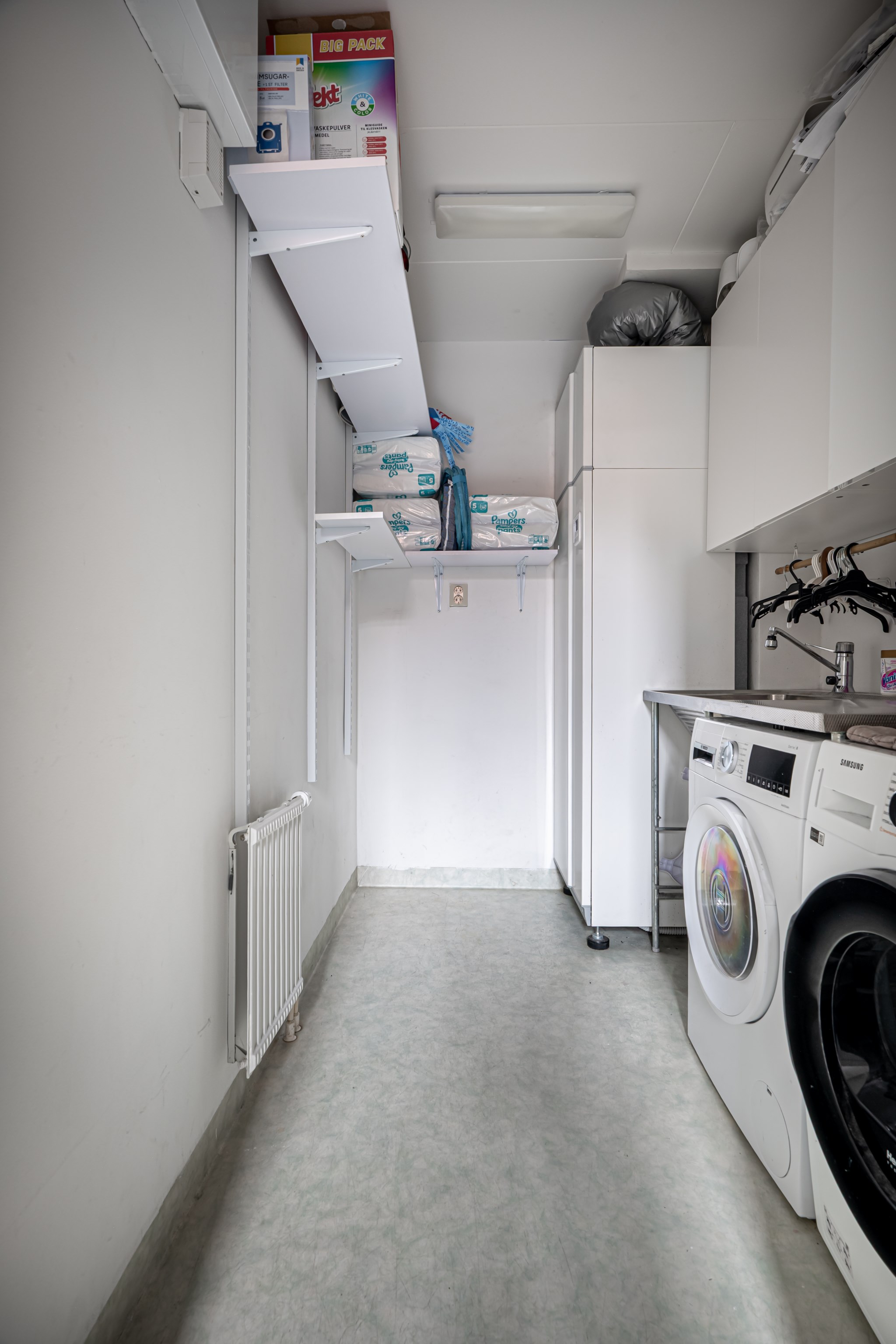 Intill ligger en praktisk tvättstuga med nyare tvättmaskin och torktumlare, arbetsbänk i rostfritt med tvättho samt god förvaring i överskåp.