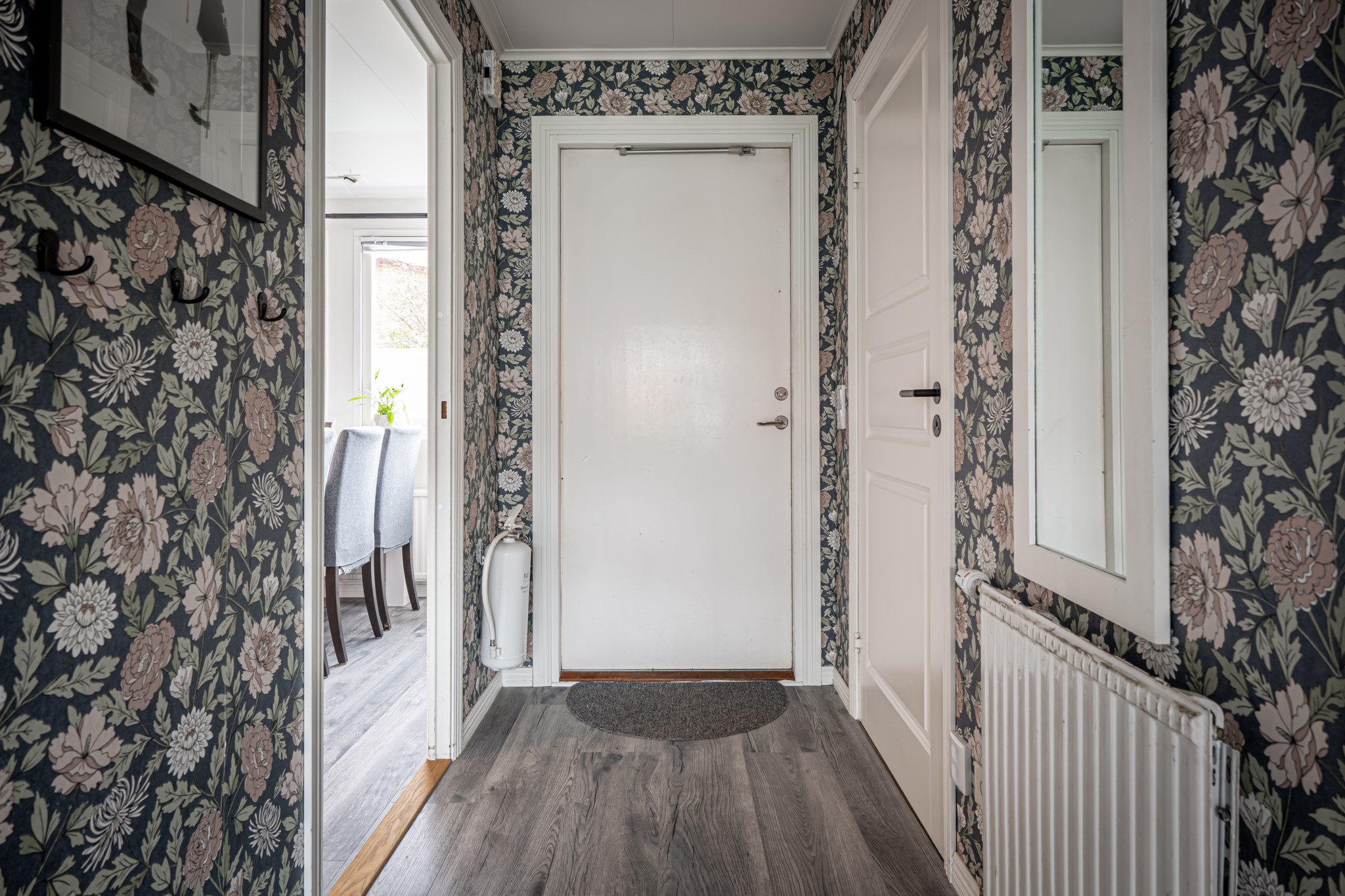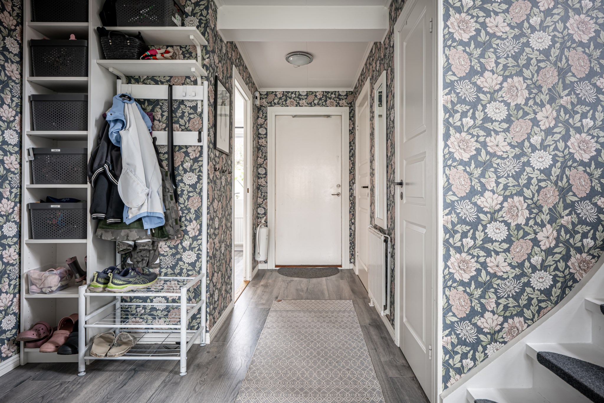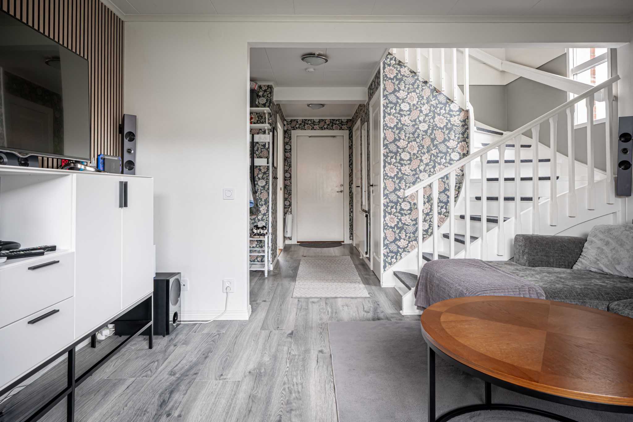 Välkomnande hall med mönstrad tapet och nytt golv som löper vidare genom nästan hela entréplanet och skapar ett enhetligt intryck. Plats för avhängning finns praktiskt ett par kliv in i hallen och behövs extra förvaring finns även ett förråd in under trappan.