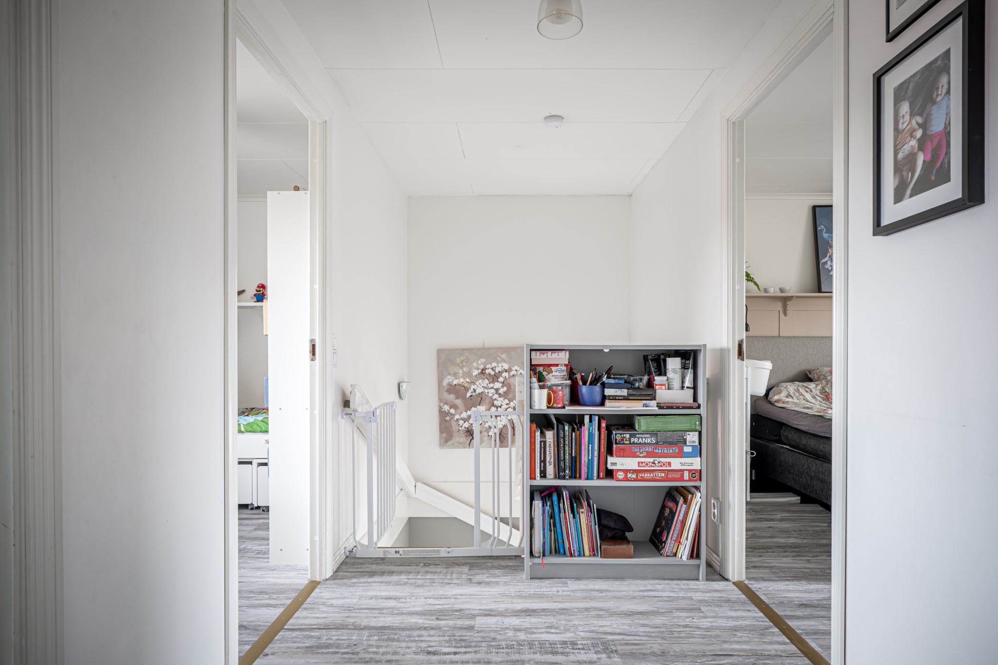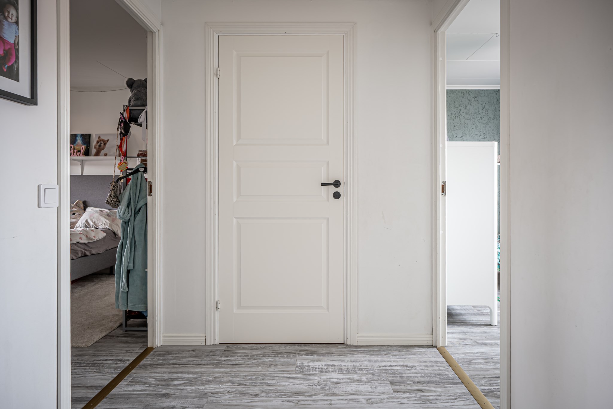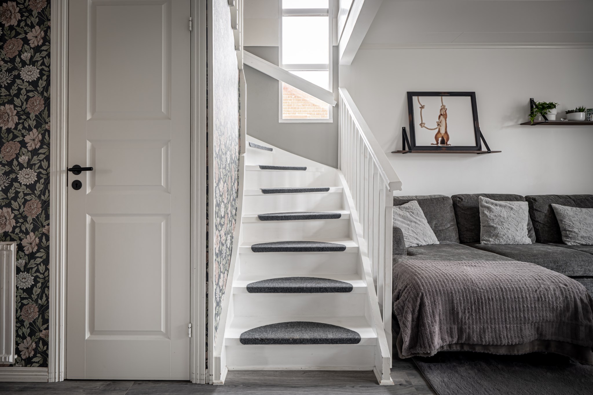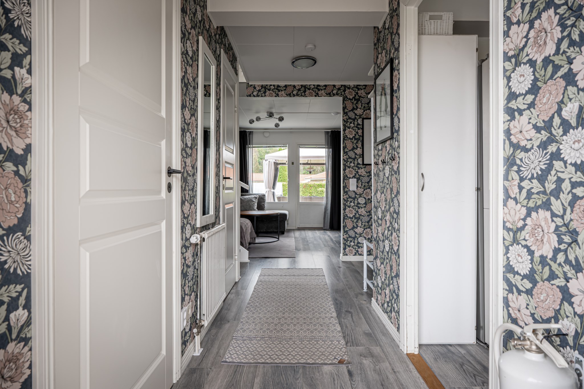 Välkomnande hall med mönstrad tapet och nytt golv som löper vidare genom nästan hela entréplanet och skapar ett enhetligt intryck. Plats för avhängning finns praktiskt ett par kliv in i hallen och behövs extra förvaring finns även ett förråd in under trappan.
