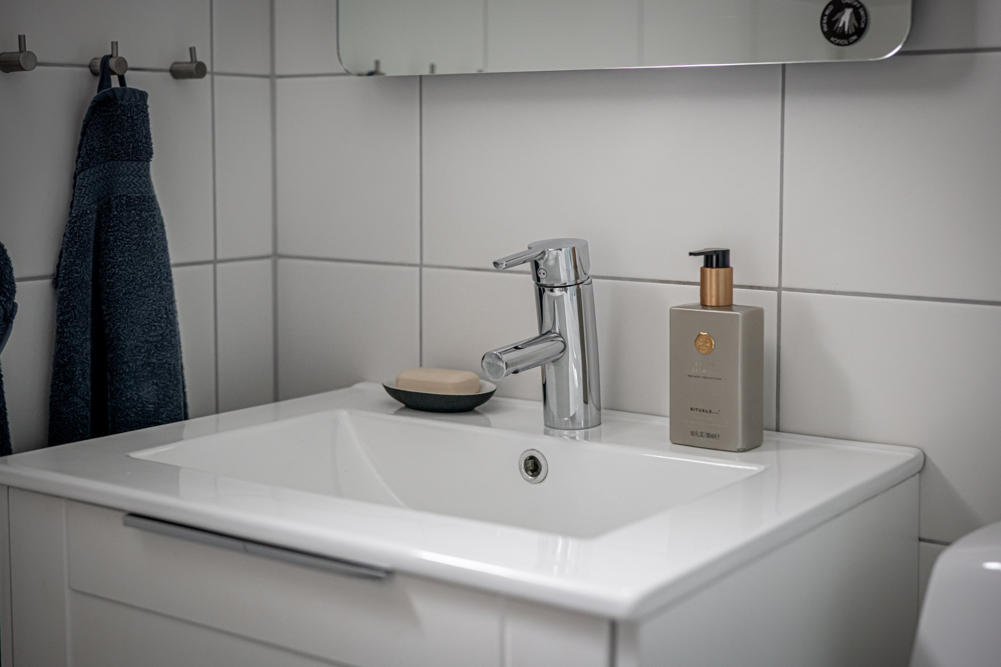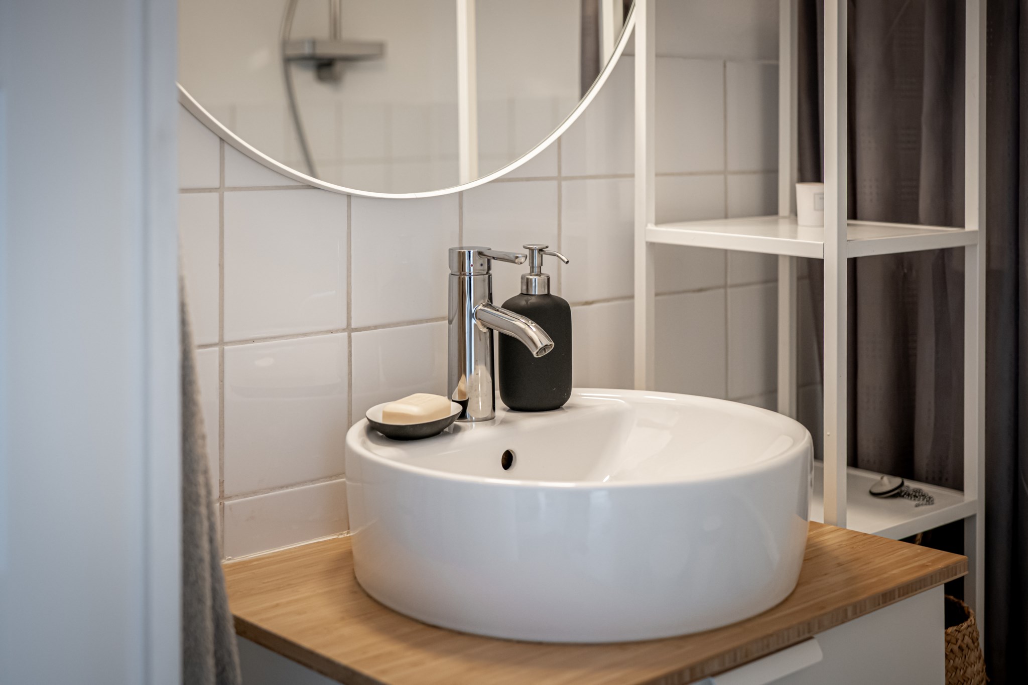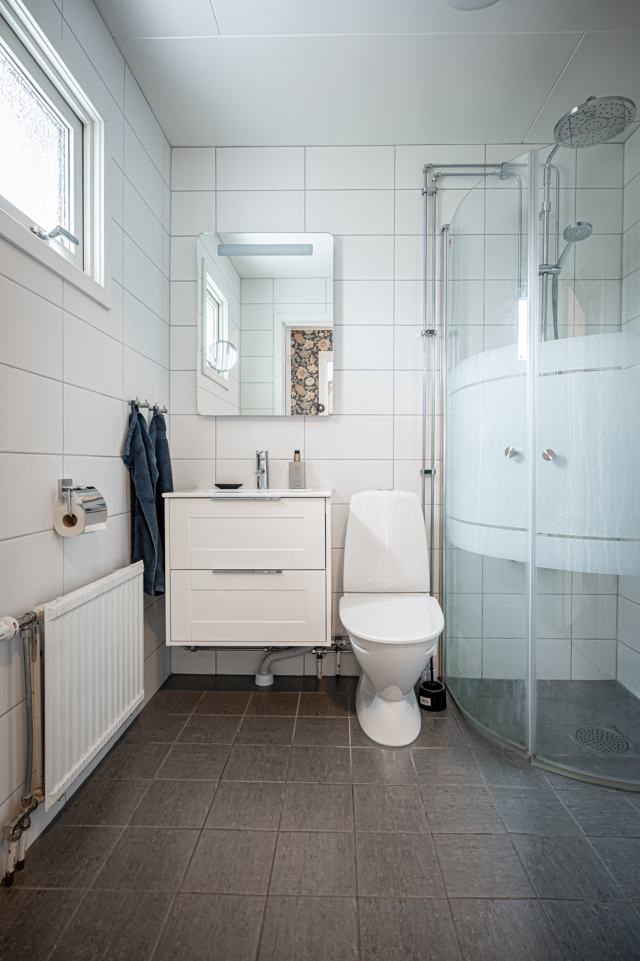 Två badrum underlättar vardagen. På entréplan finns ett badrum som totalrenoverades 2021 med helkaklade väggar, modern kommod, wc och rymlig duschhörna med glaspartier. På övre plan finns ytterligare ett badrum med wc, kommod och badkar, halvkaklade väggar och våtrumsmatta – smidigt som familjebadrum mellan alla sovrum.