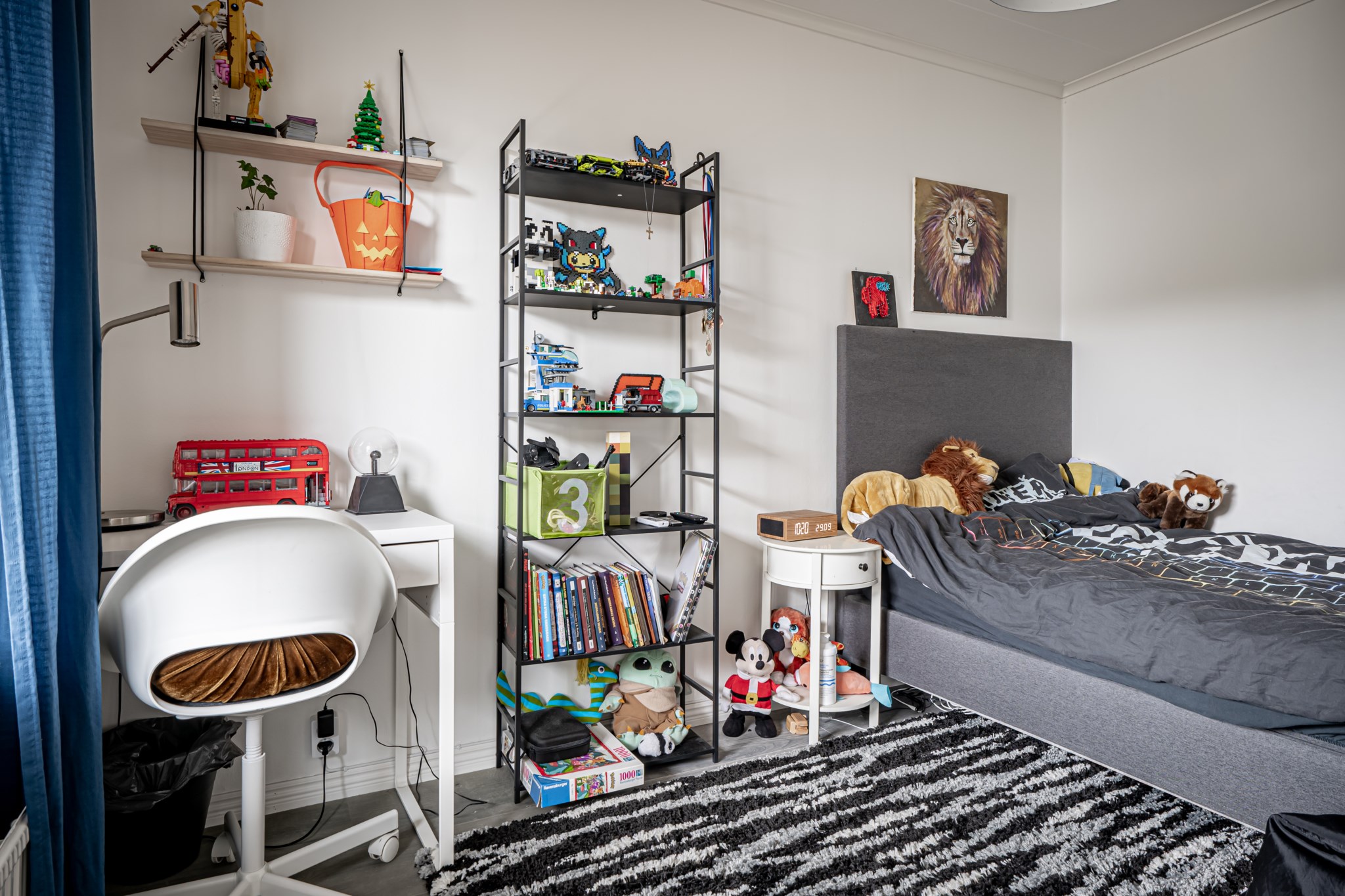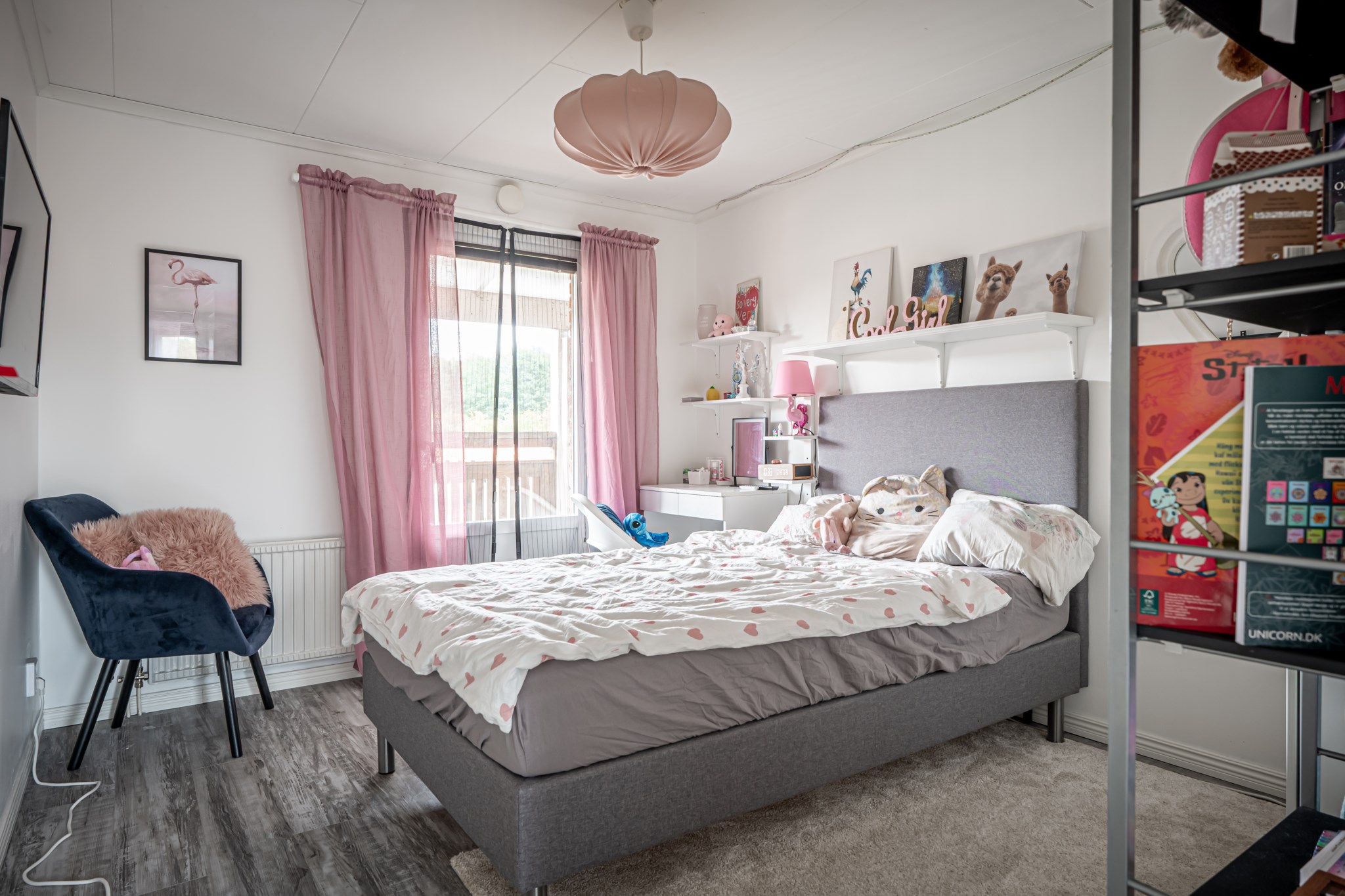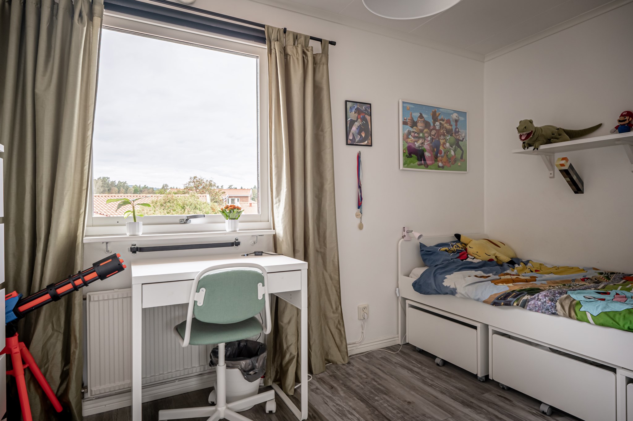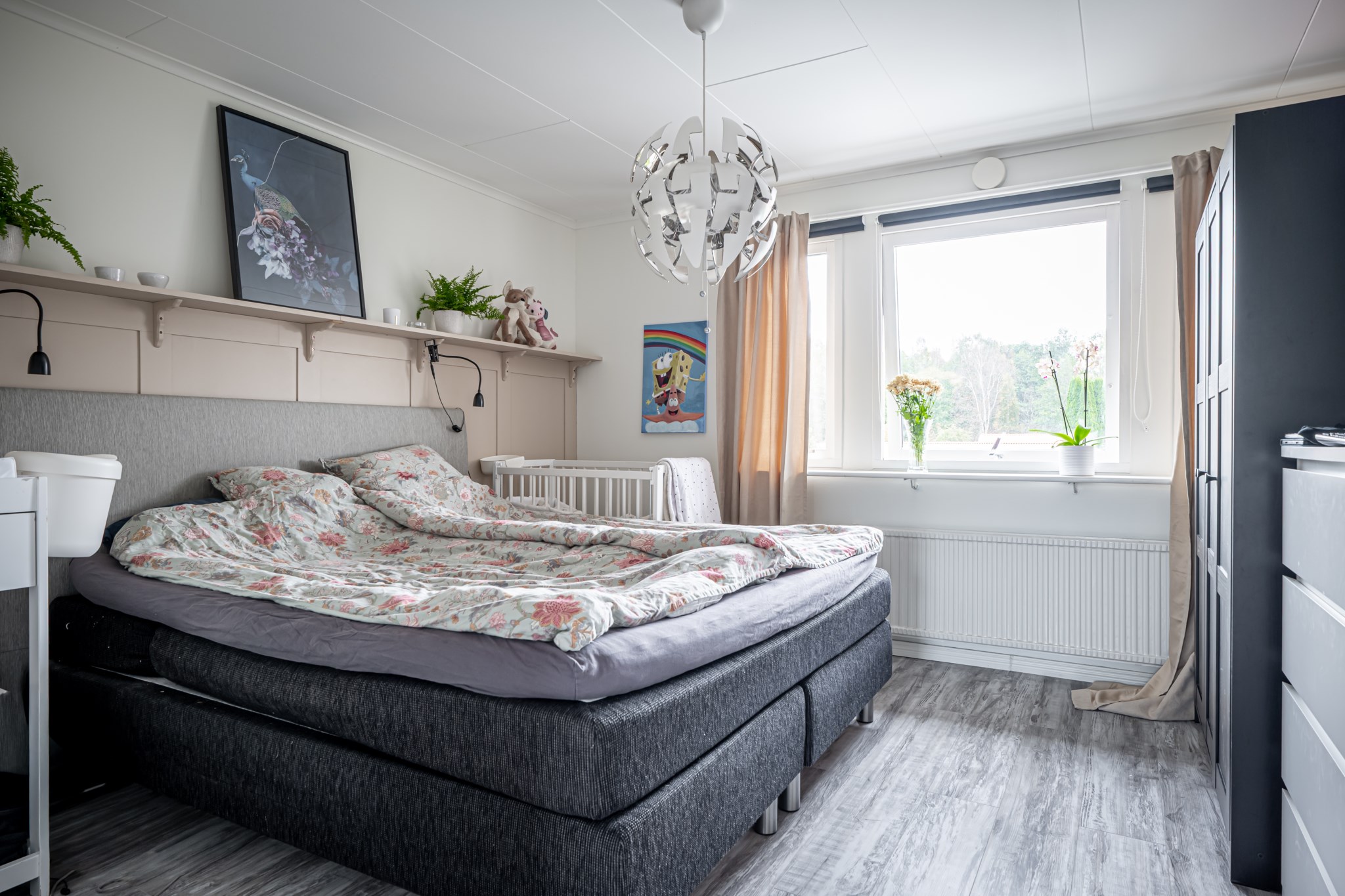 Totalt fem sovrum – fyra på övre plan samlade kring den övre hallen och ett praktiskt beläget innanför vardagsrummet på entréplanet. Rummen är lättmöblerade med neutrala ytskikt och gott om plats för säng och förvaring. Från det sydöstra sovrummet finns dessutom en utgång till baksidan balkong.