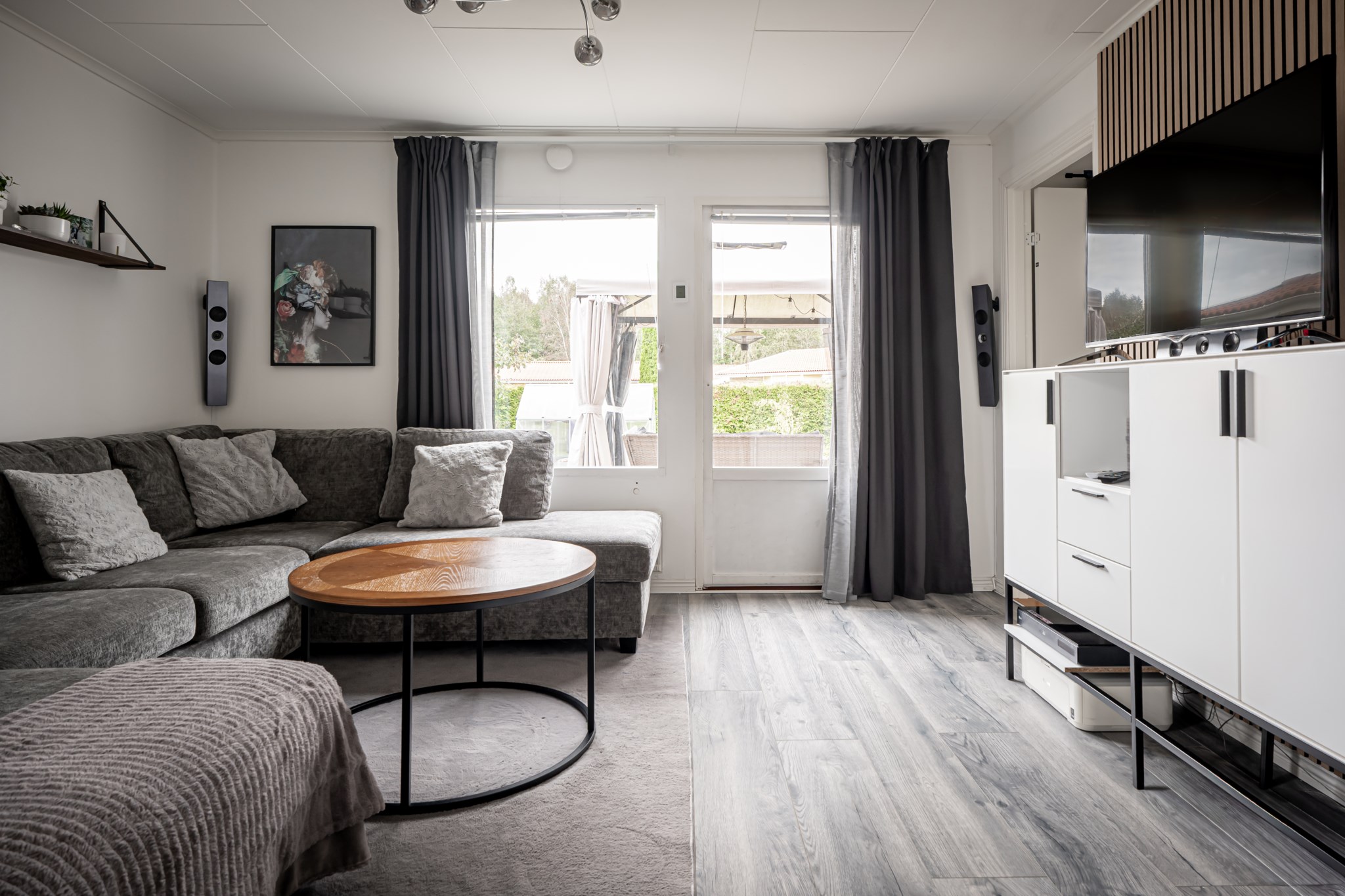Ljust och lättmöblerat vardagsrum med samma enhetliga golv som i hall och kök. Rummet är idag avdelat och rymmer ett extra sovrum/kontor, men väggen kan enkelt tas bort för den som vill återfå ett större sällskapsrum. Utgång till baksidans uteplats och trädgård.