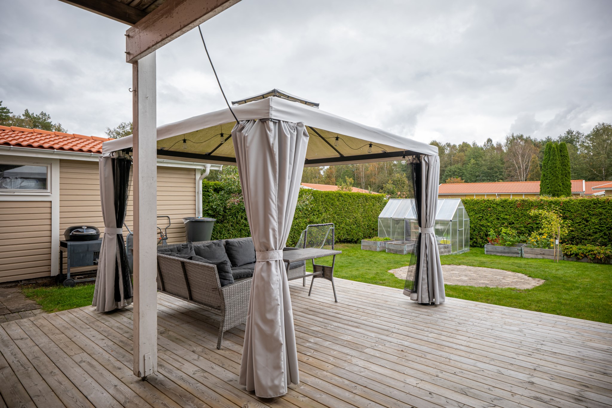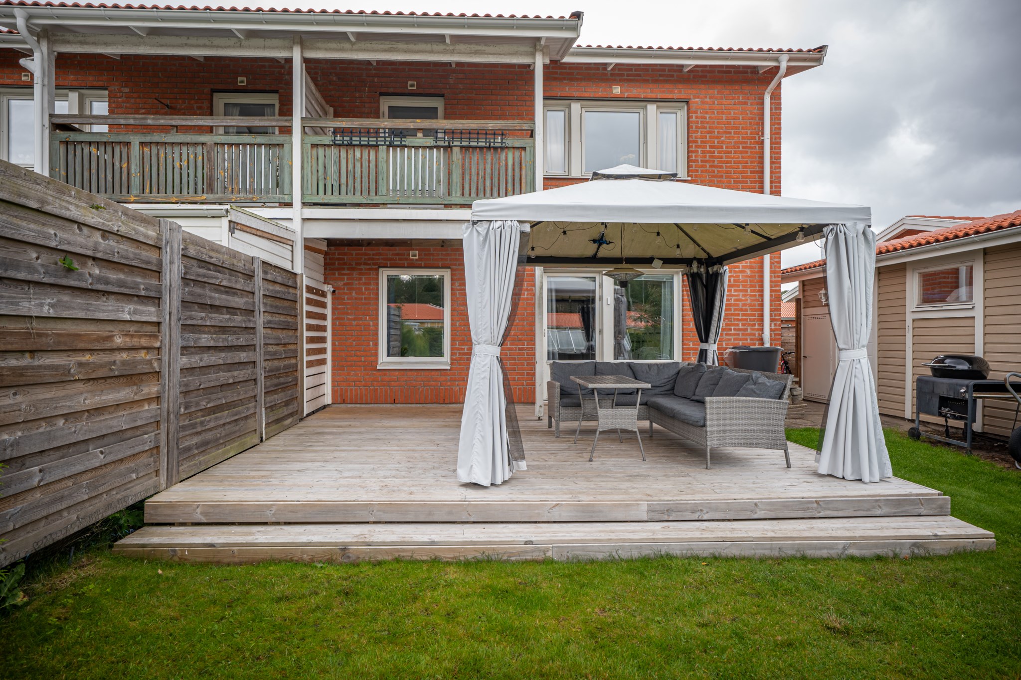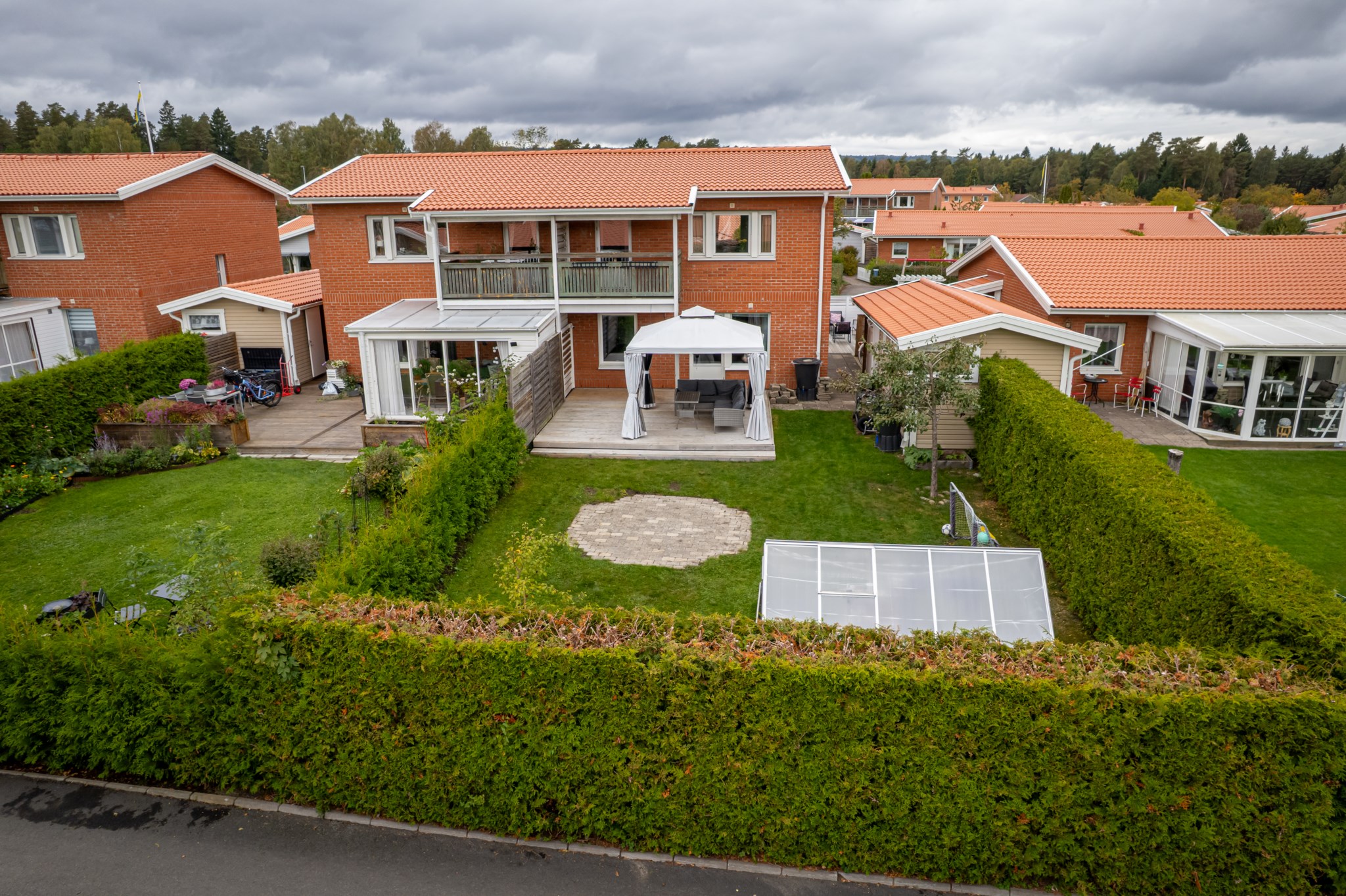 Väl omhändertaget parhus i två plan om ca 104 kvm, 6 rum och kök. Här finns fina uteytor för alla lägen: en trevlig framsida, en generös altan och gräsyta på baksidan samt balkong med härlig morgonsol. Den lättskötta trädgården ramas in av häck, kompletteras av praktiskt förråd och ett nyare växthus för odlaren. Precis utanför huset väntar lekplatsen – perfekt för barnfamiljen.