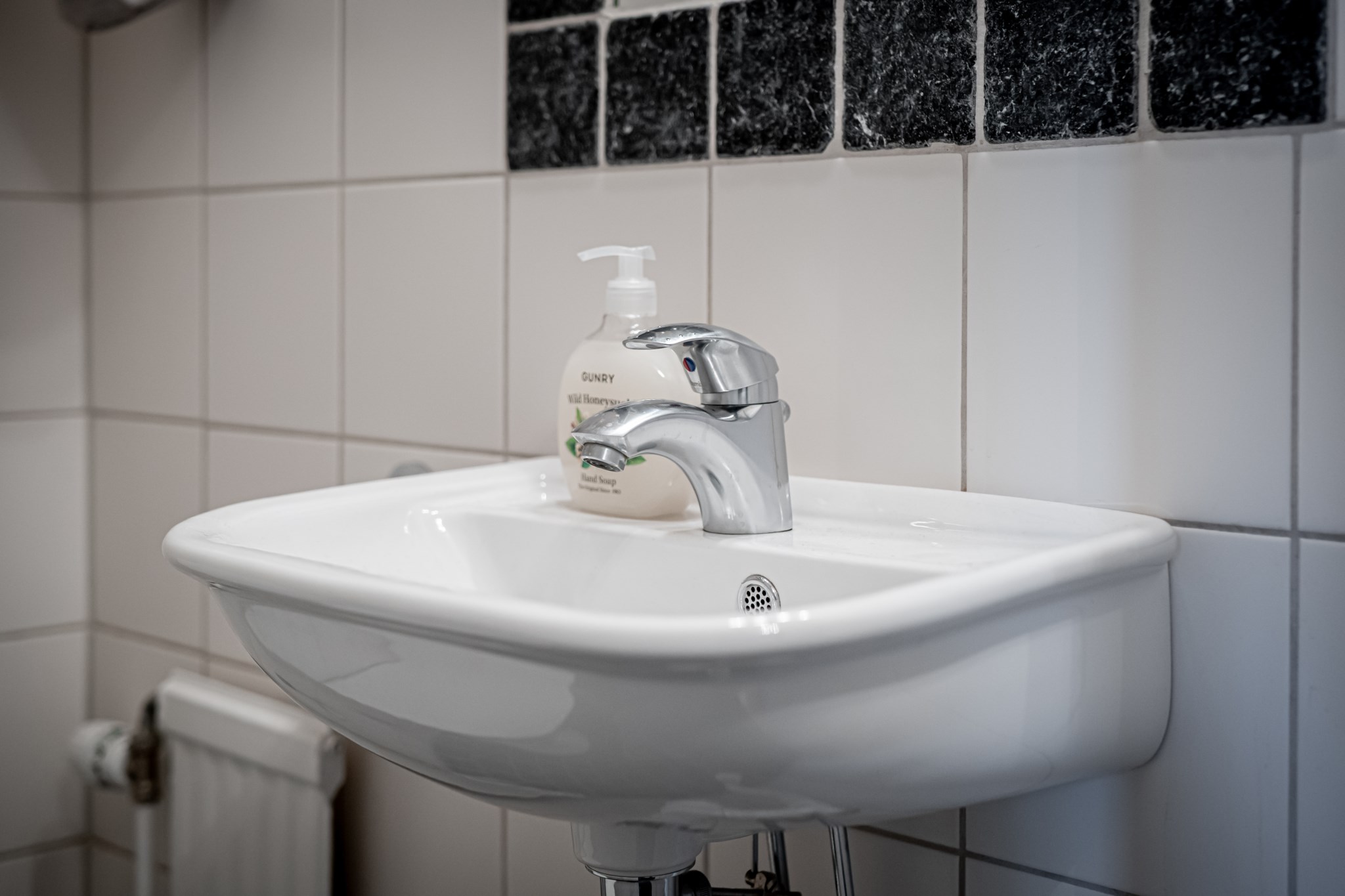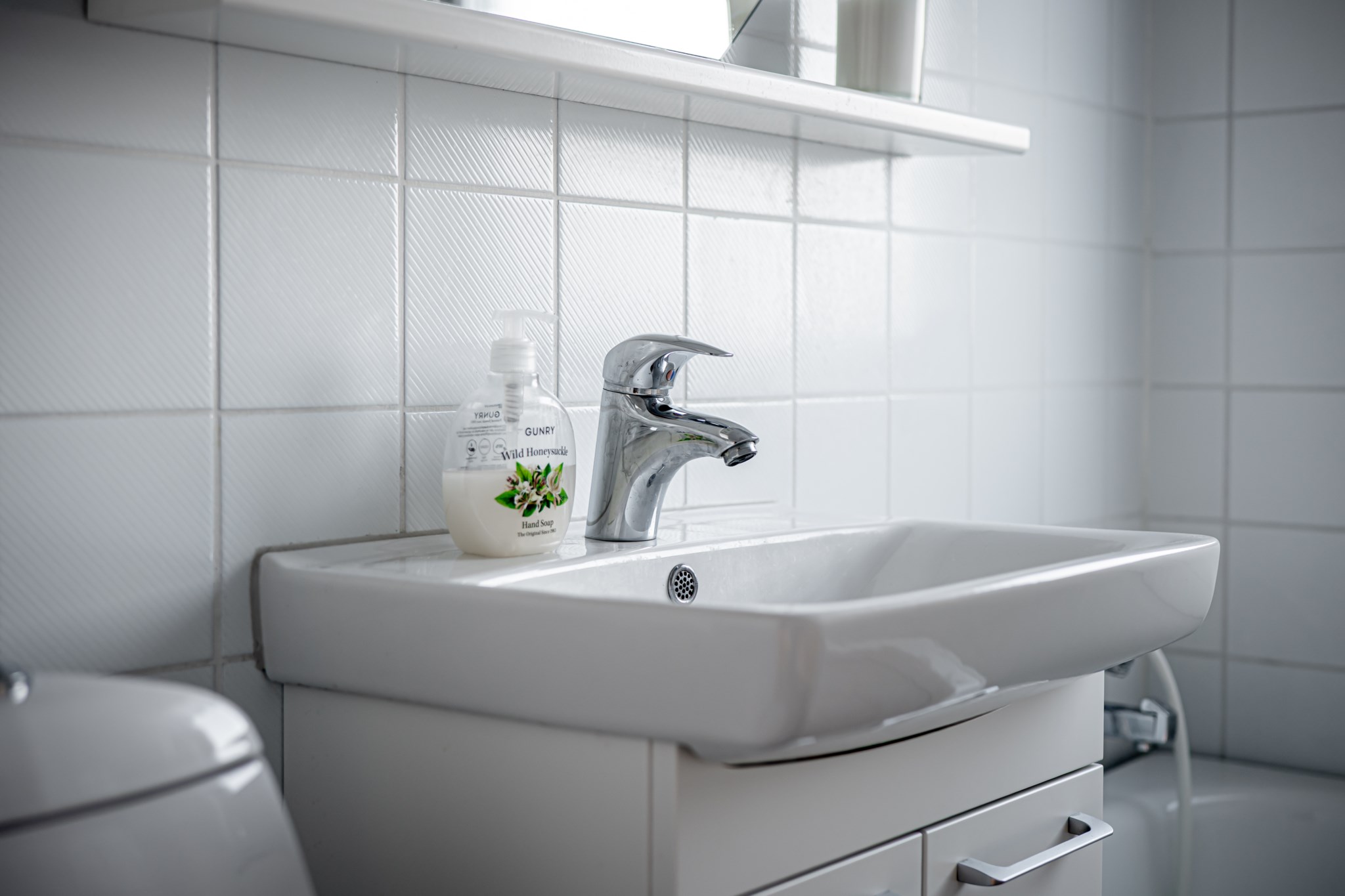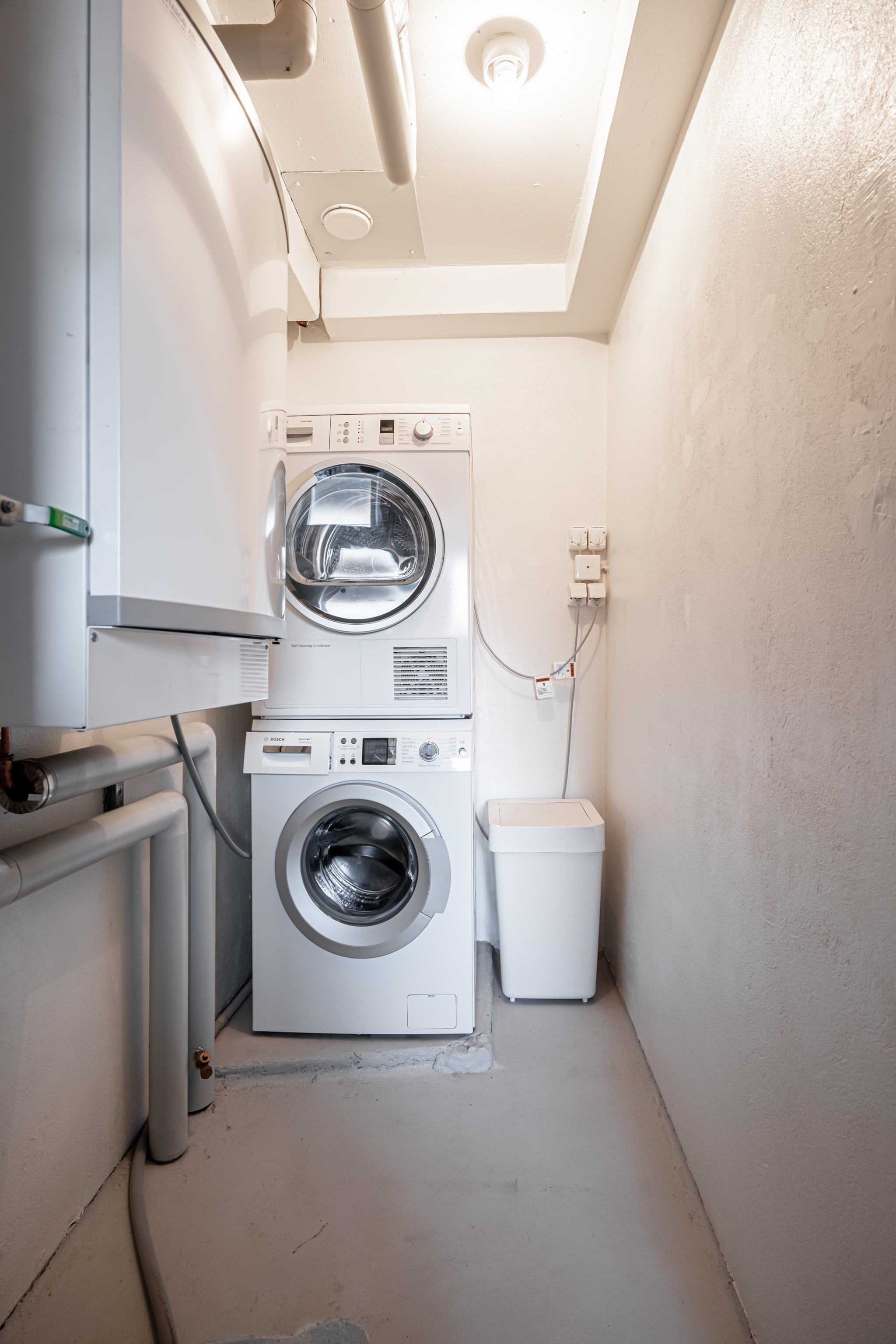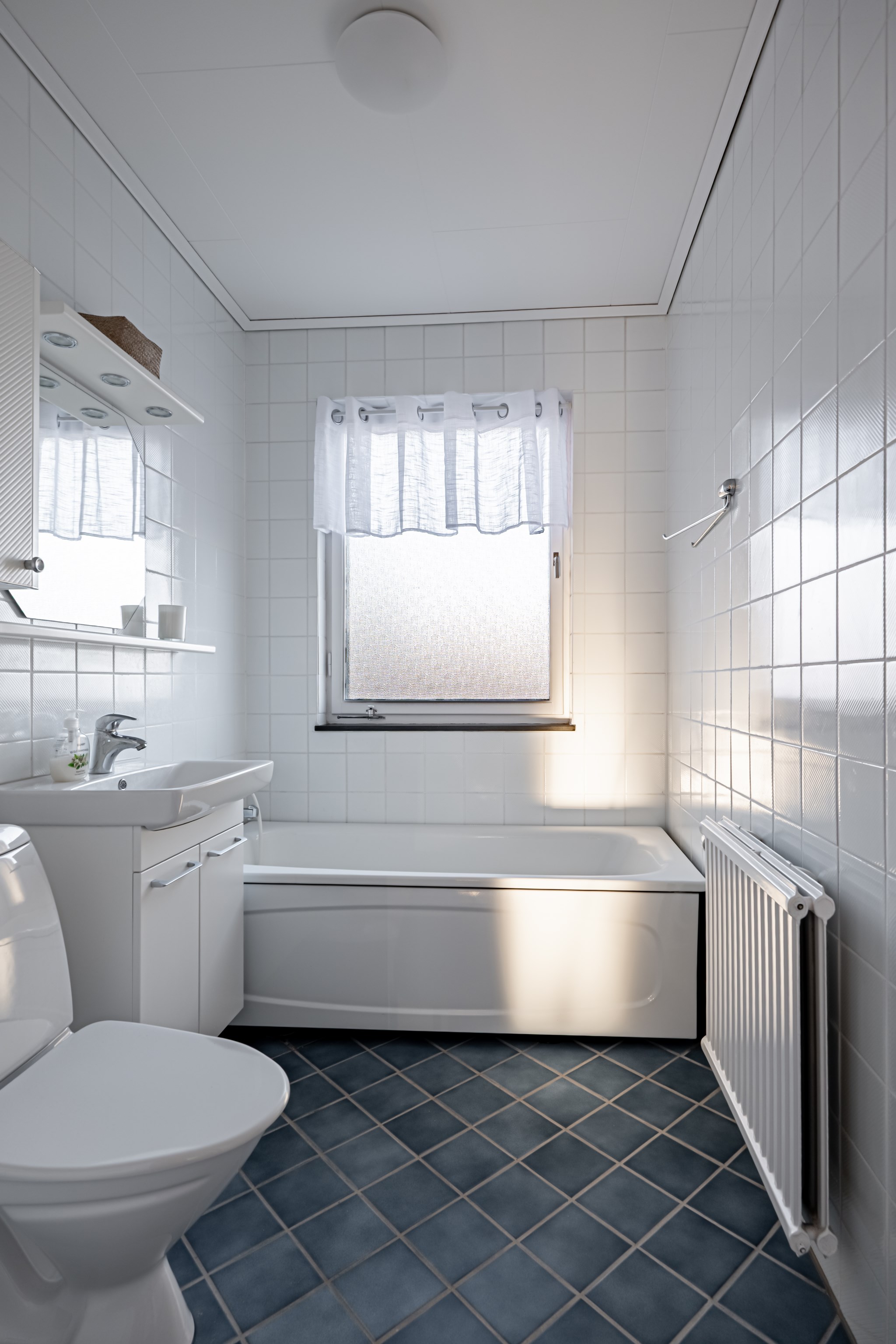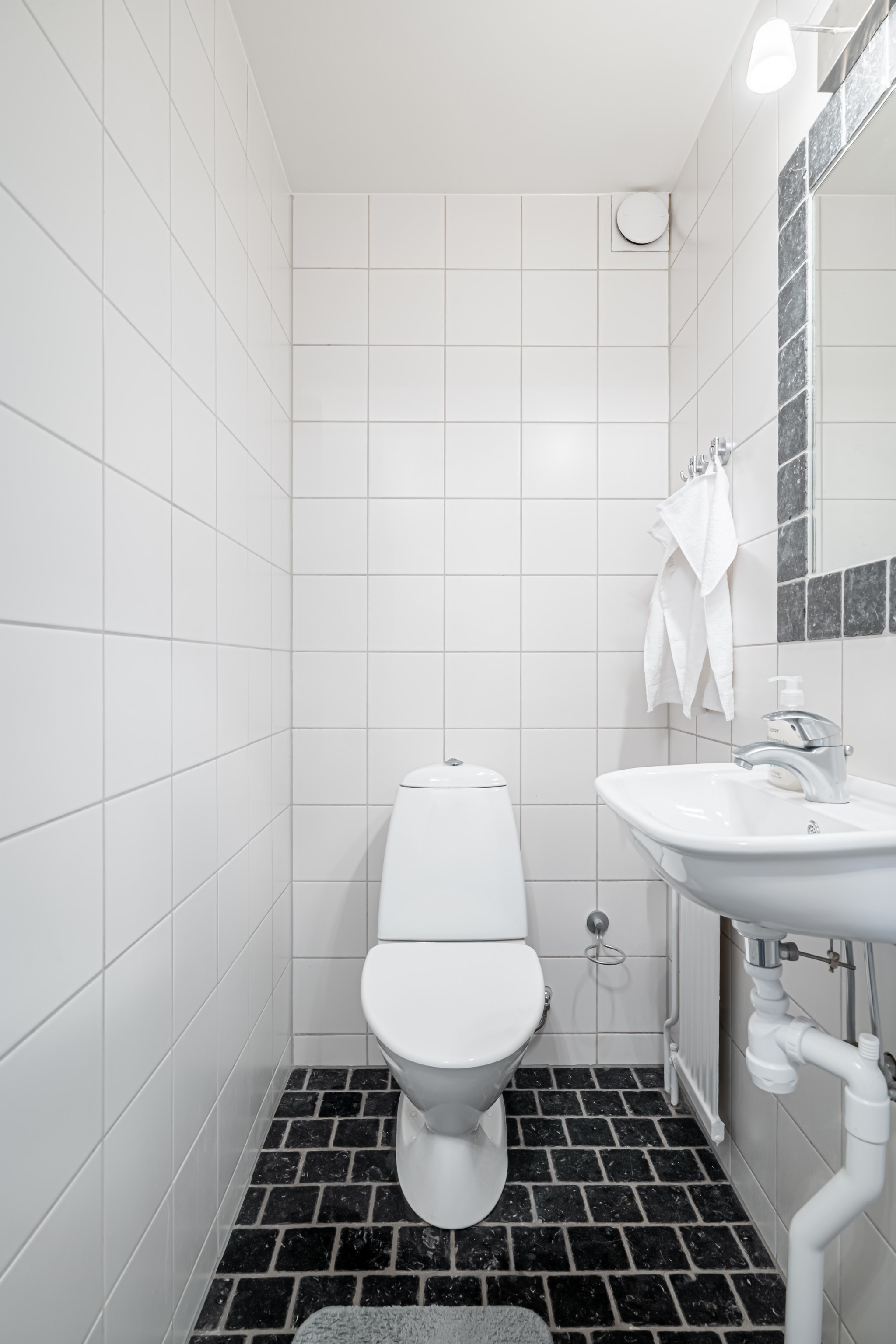 På entréplanet finns en praktisk tvättstuga med tvättmaskin, torktumlare och dusch – ett funktionellt utrymme för vardagens behov. Här finns även en separat wc med stilrent kakel. En trappa upp ligger bostadens badrum, helkaklat i ljusa toner och utrustat med wc, handfat och badkar. El och belysning bytt i övre planets badrum 2023