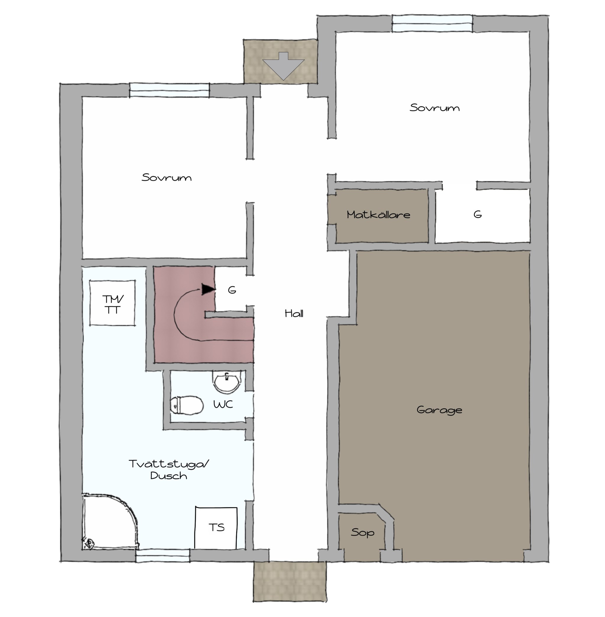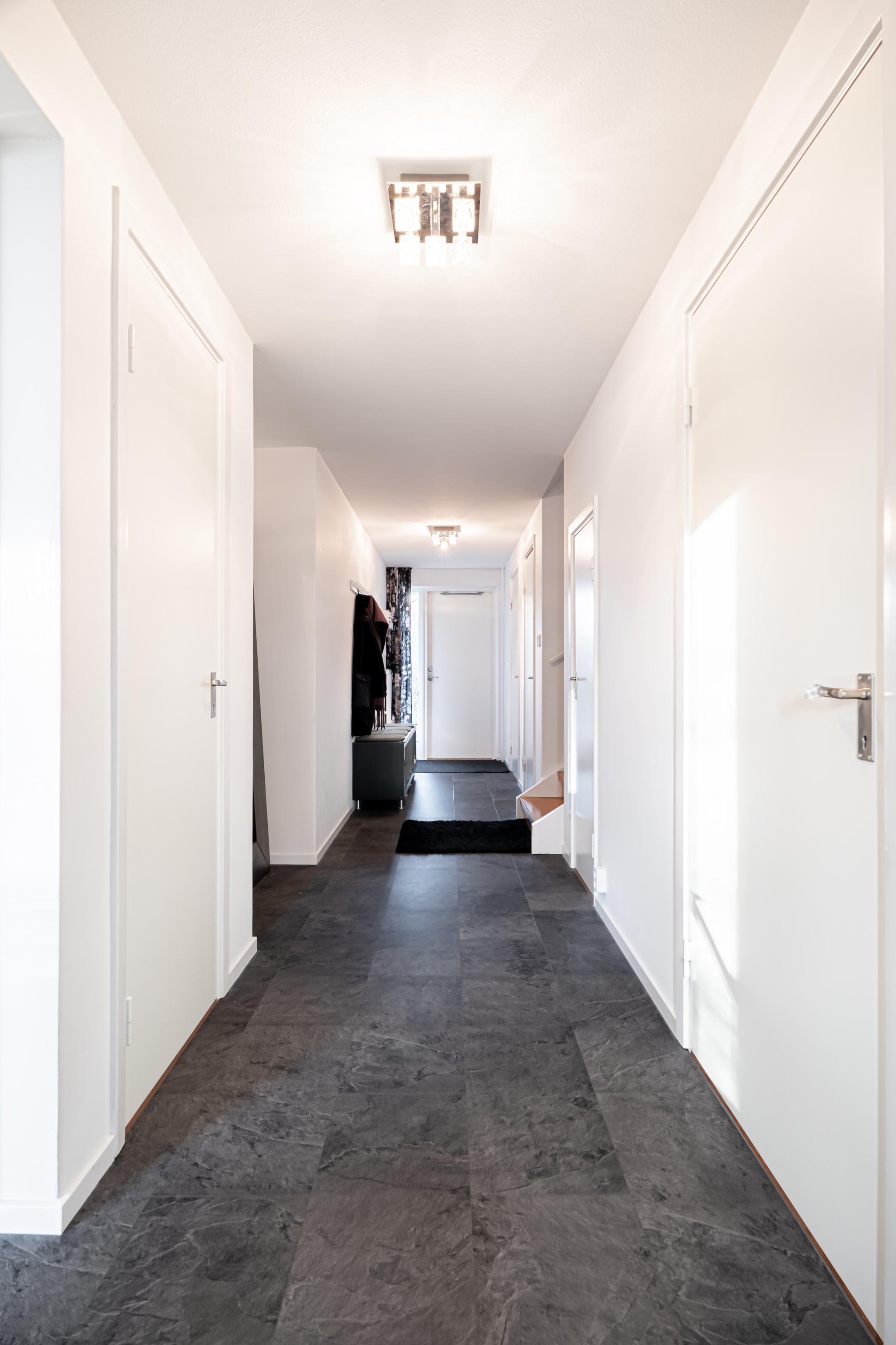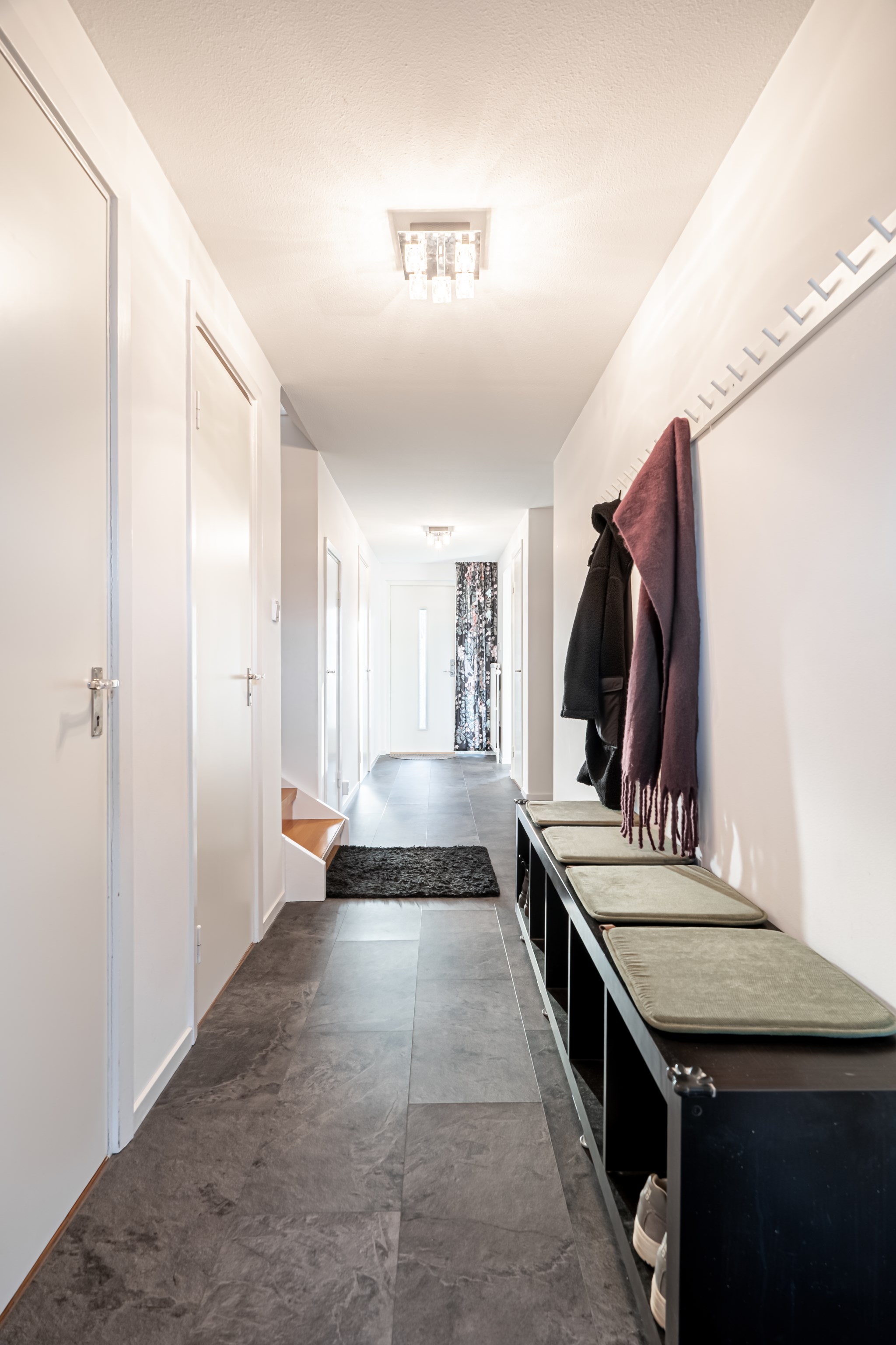 Välkommen in i hallen med gott om plats för ytterkläder och skor. Ljusa väggar tillsammans med det mörktonade laminatgolvet från 2020 ger ett modernt och stilrent intryck. Vägg i vägg med hallen ligger garaget som ger både en bekväm vardag och smidig förvaring, eller kanske ett ytterligare sovrum om behov finns.
