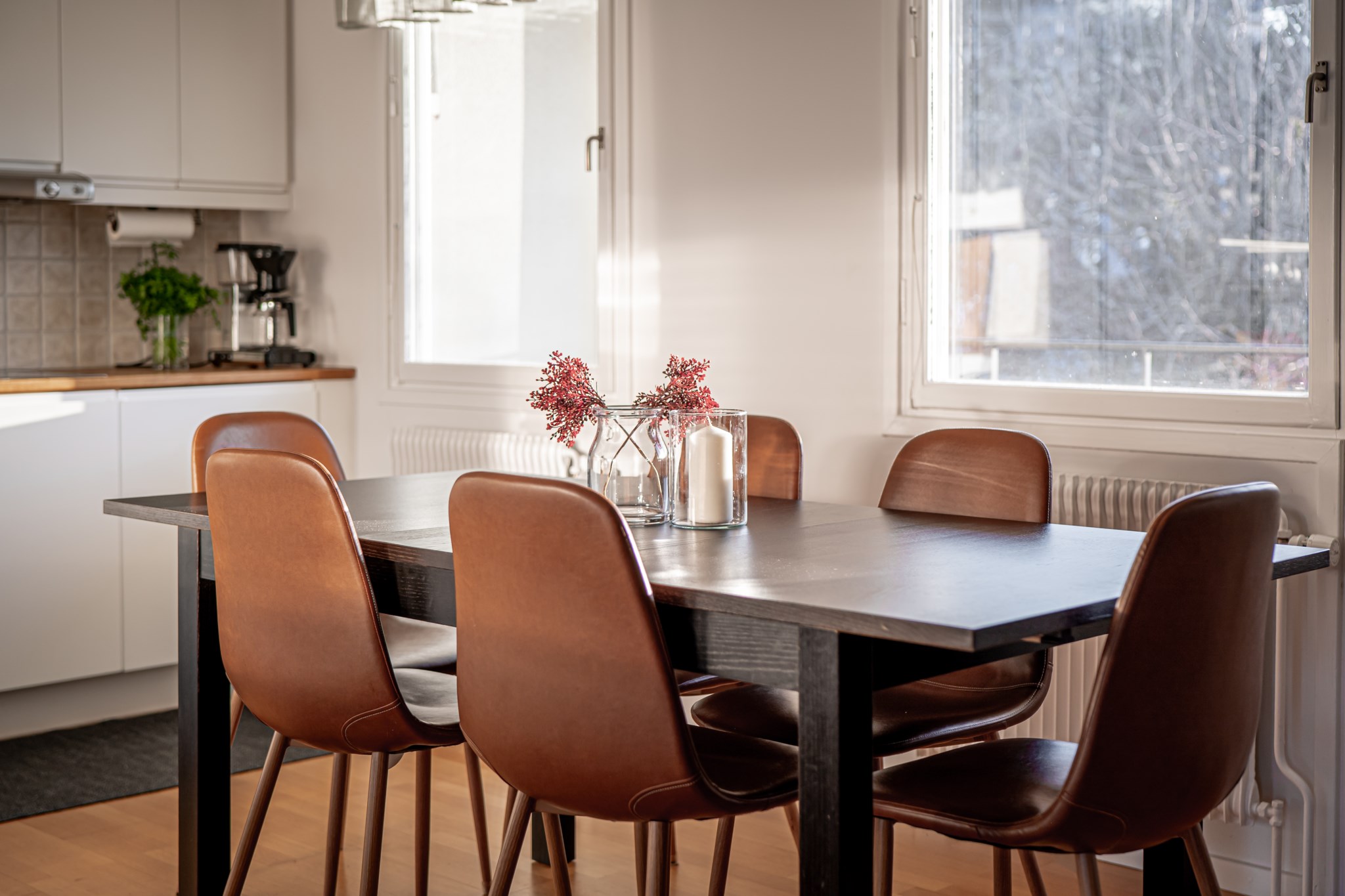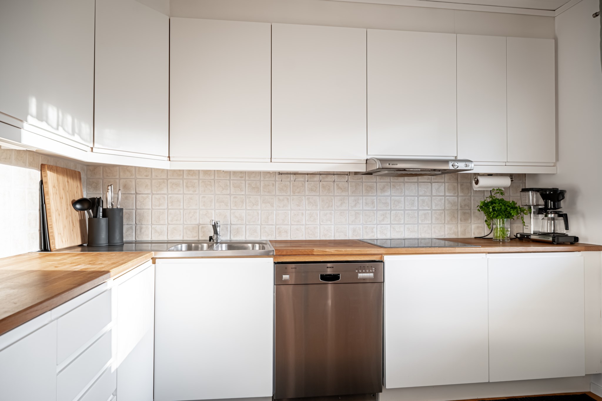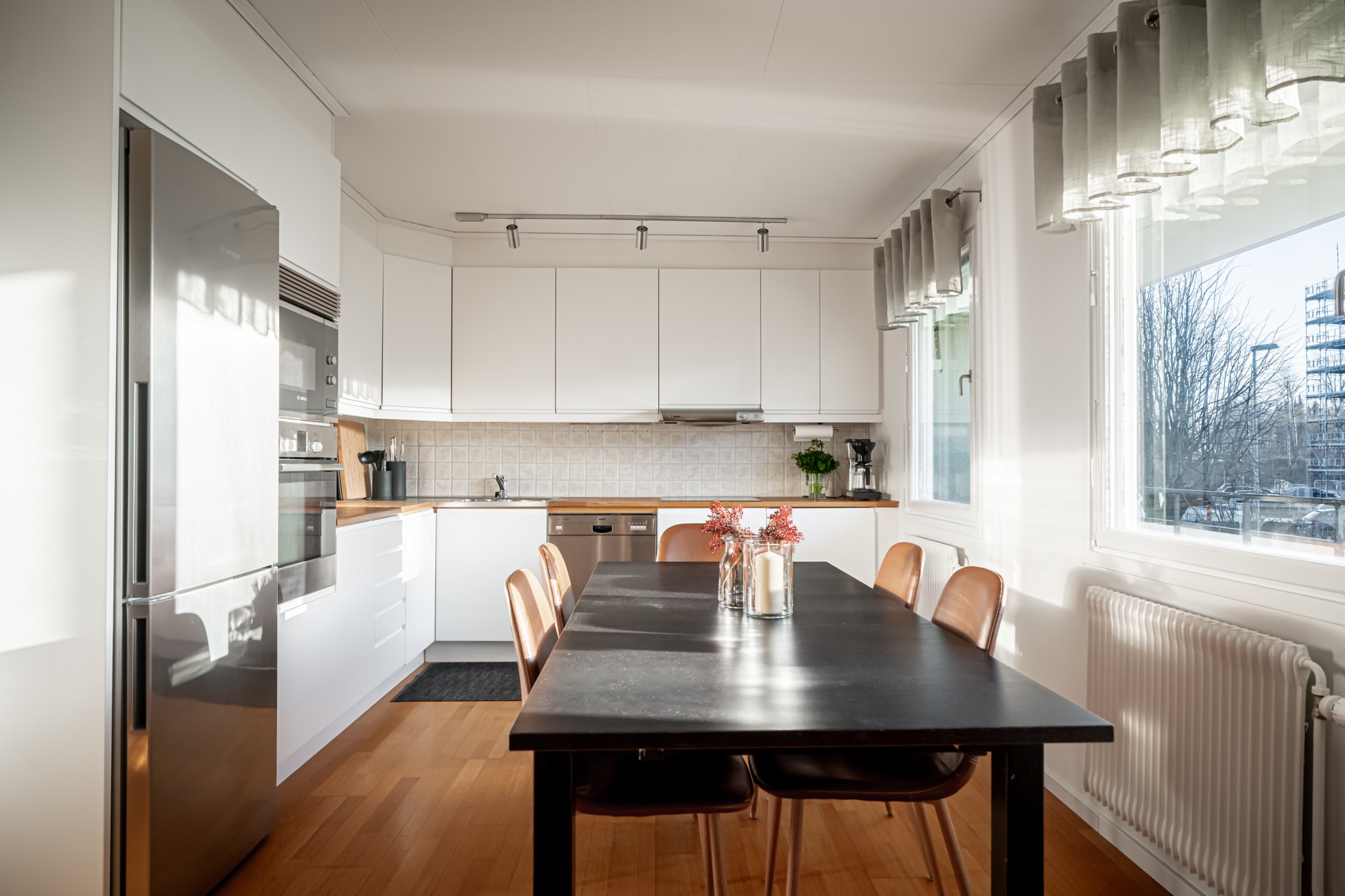 Ljust och funktionellt kök i öppen planlösning mot vardagsrummet. Utrustat med rostfria vitvaror, infälld spishäll och bänkskiva i trä. Nya köksluckor installerades 2023 och mikron är infälld från 2025. Härifrån nås även balkongen i söderläge.