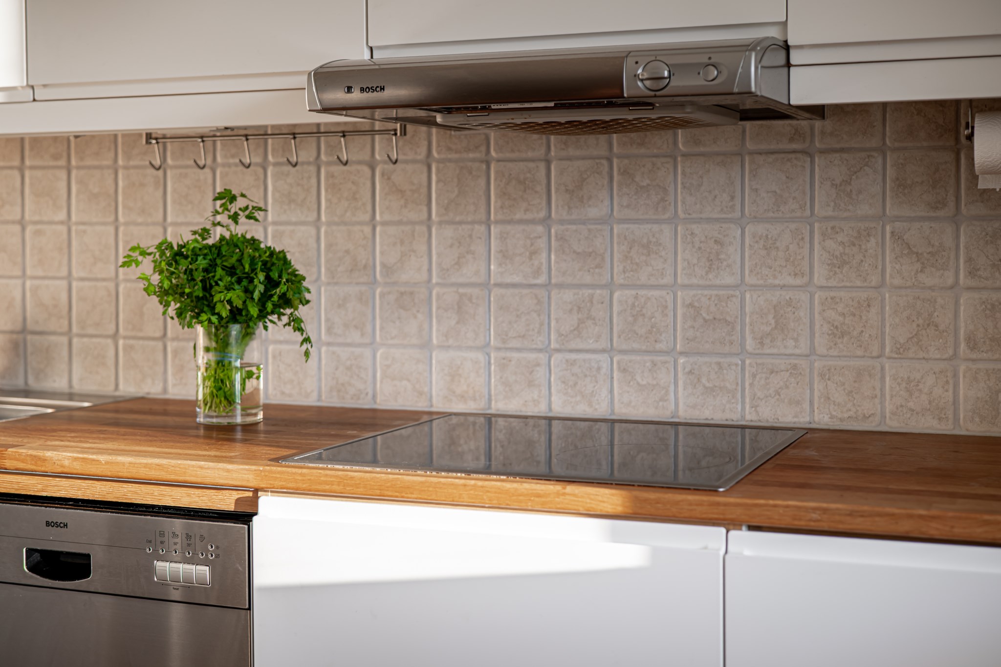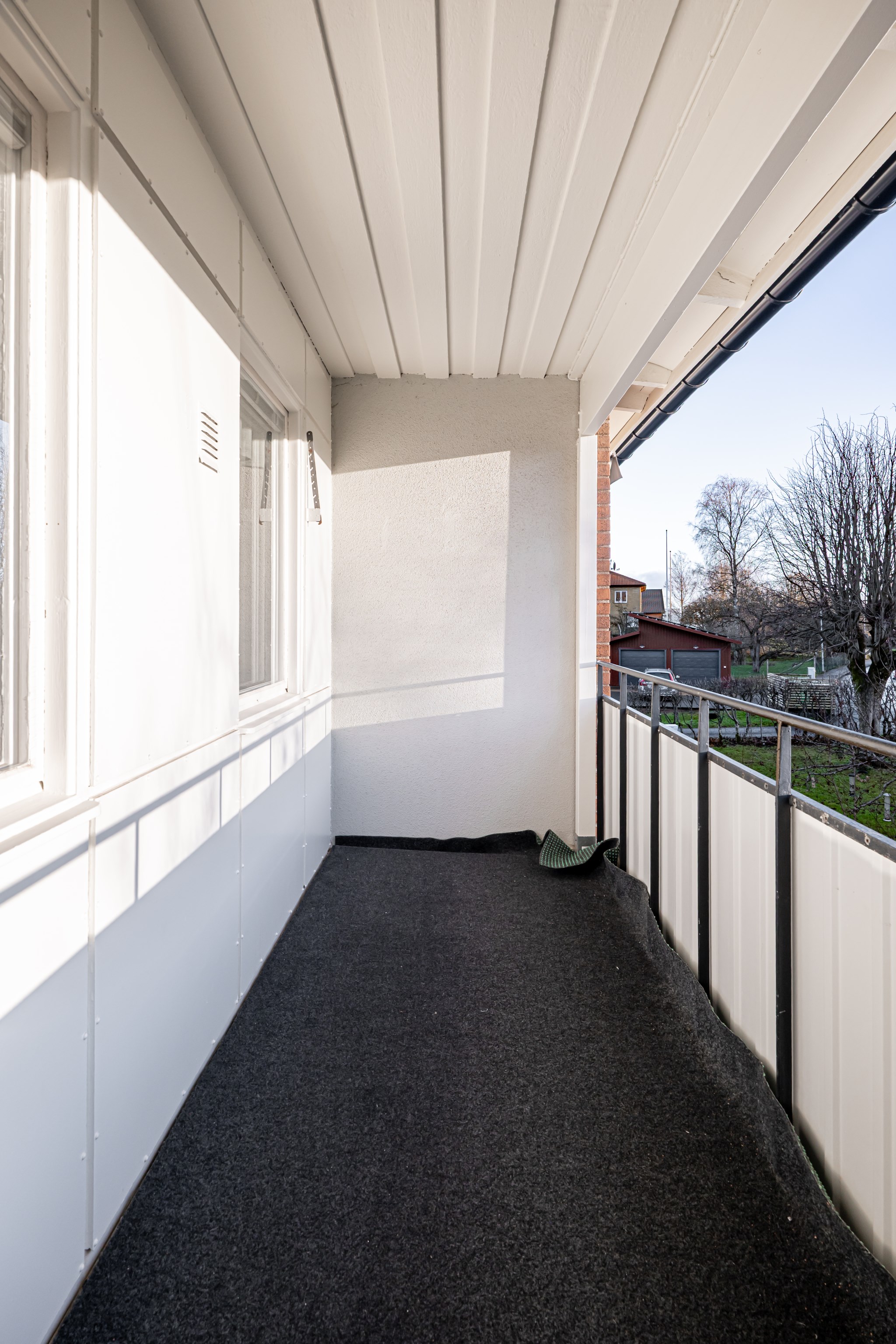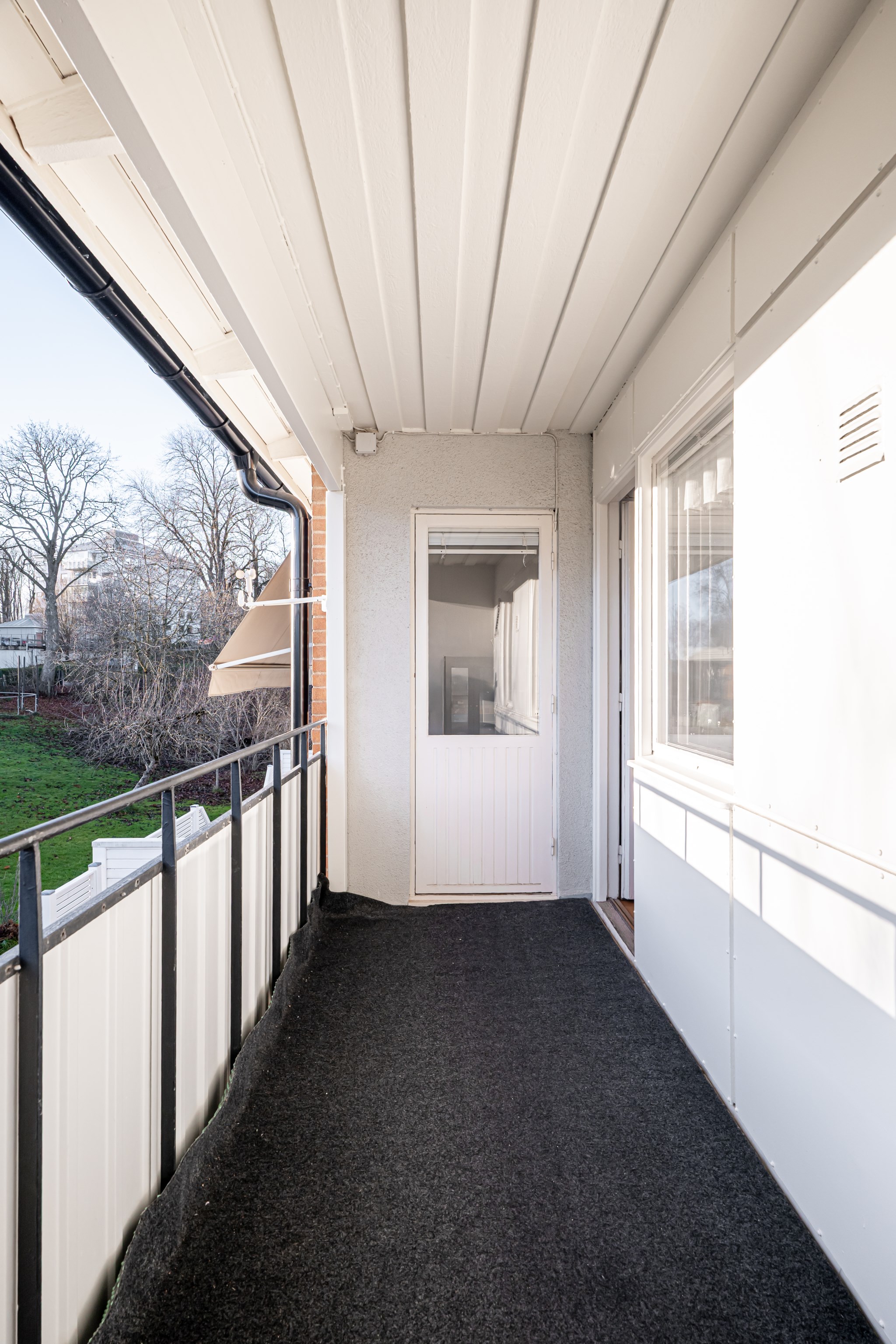 Ljust och funktionellt kök i öppen planlösning mot vardagsrummet. Utrustat med rostfria vitvaror, infälld spishäll och bänkskiva i trä. Nya köksluckor installerades 2023 och mikron är infälld från 2025. Härifrån nås även balkongen i söderläge.