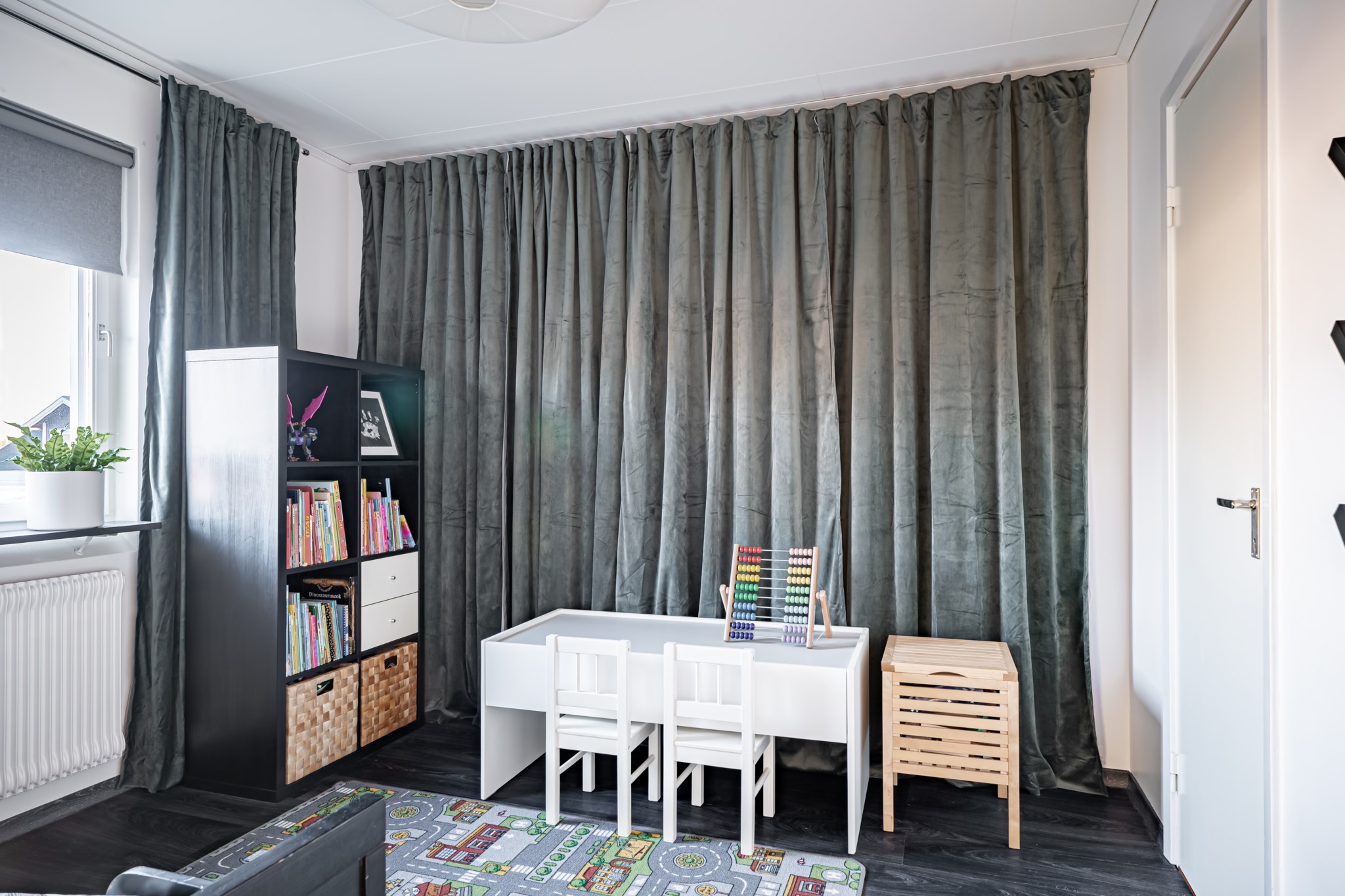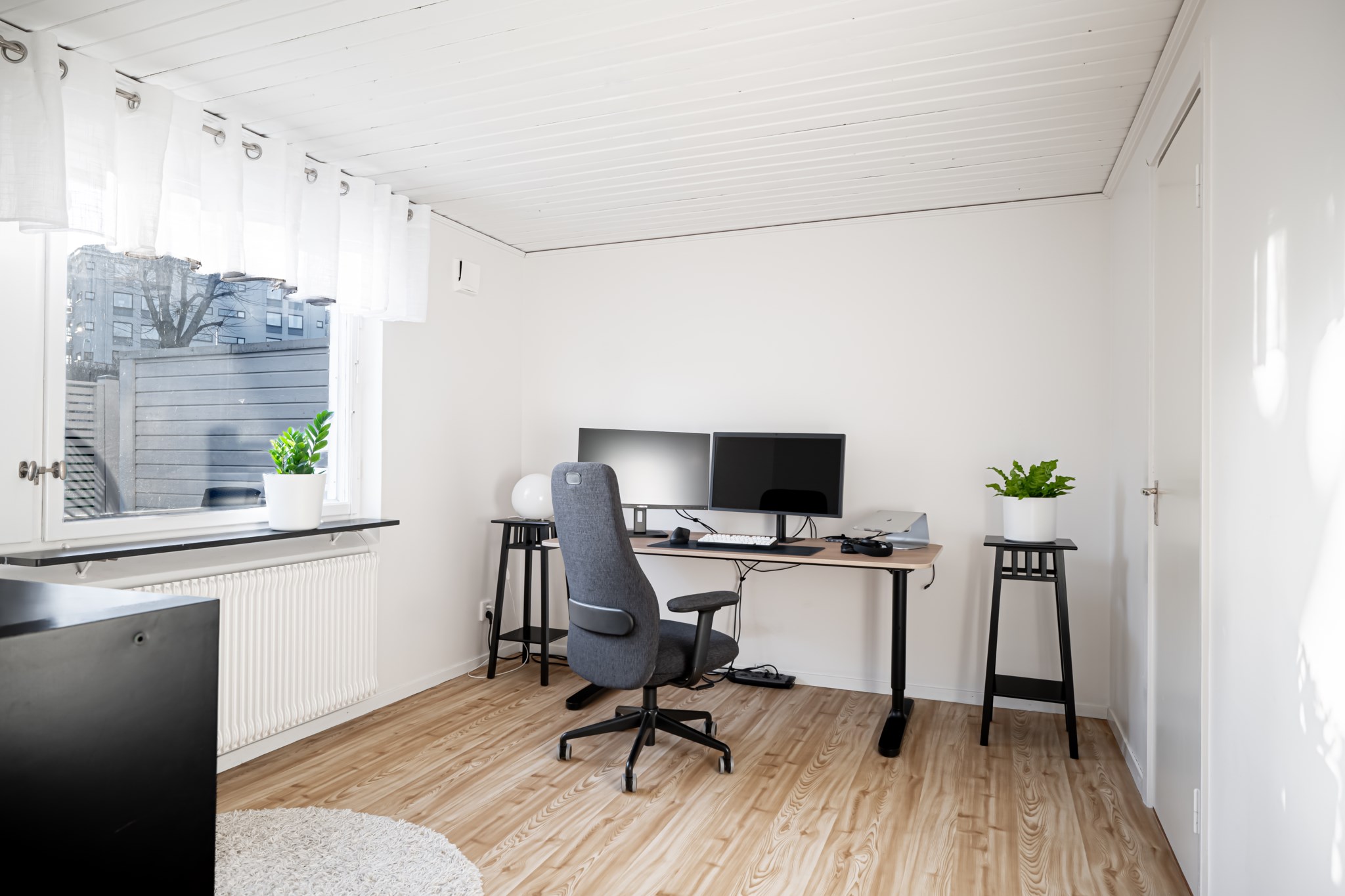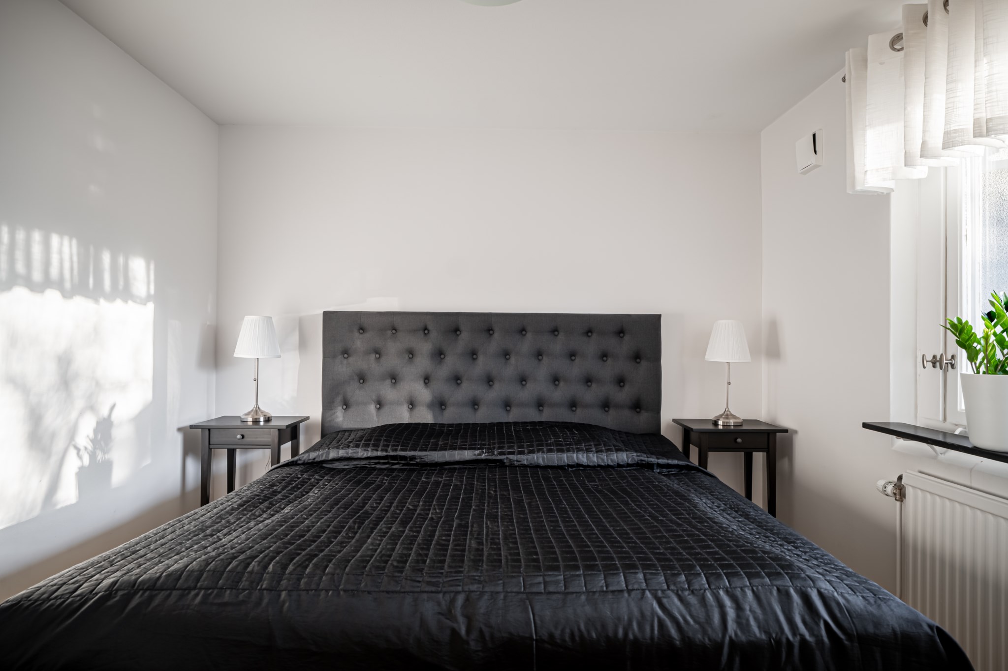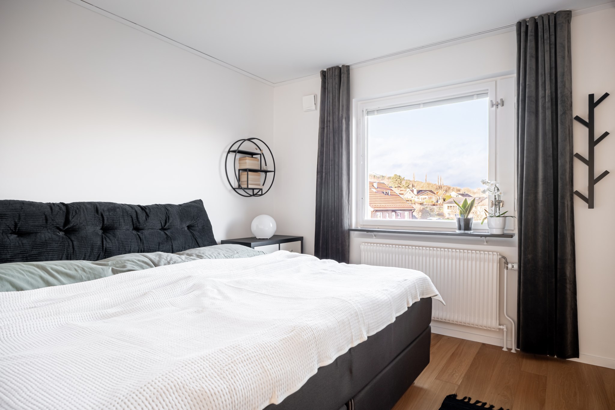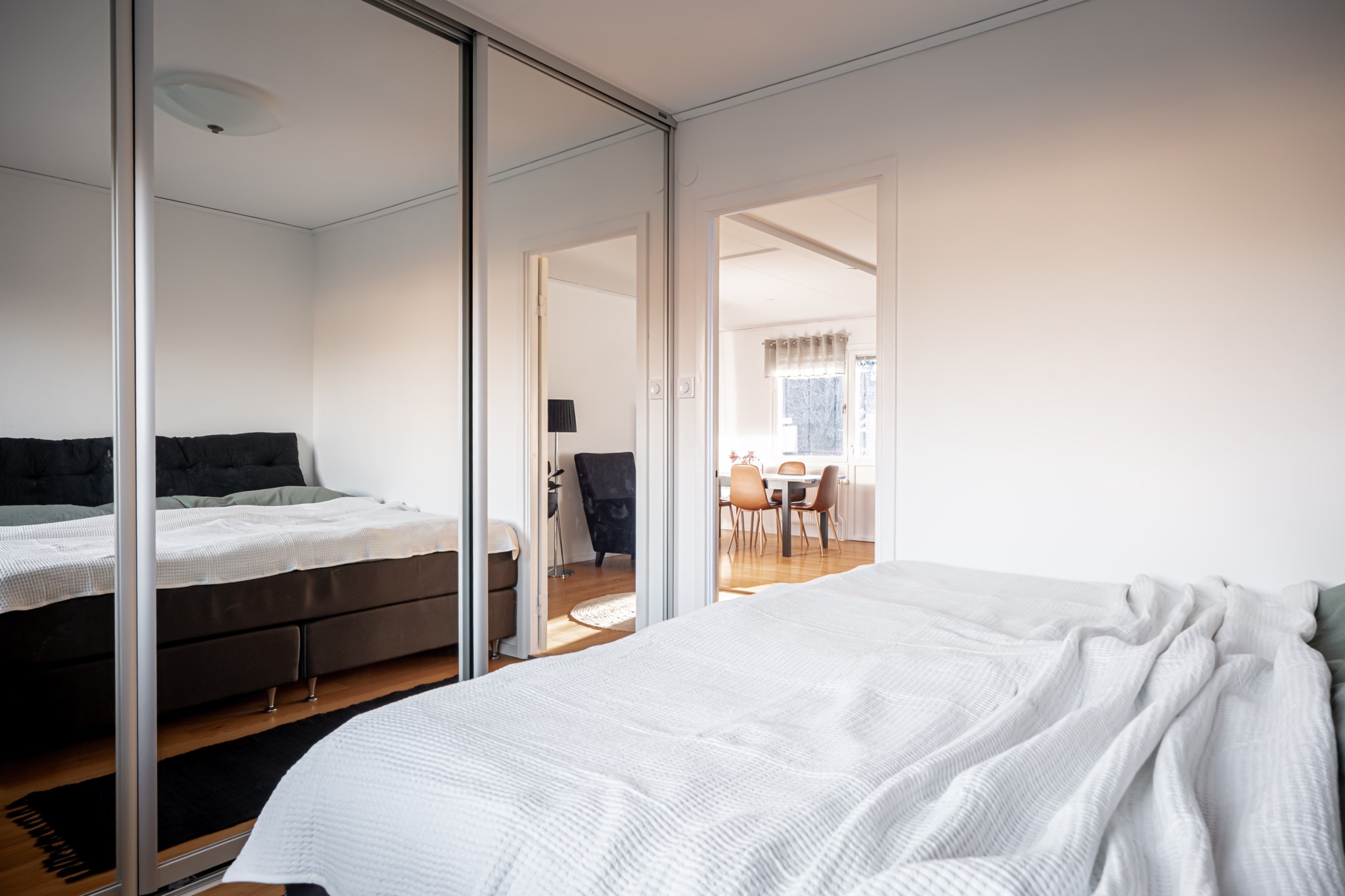 Huset rymmer fyra sovrum i varierad storlek, fördelade på båda planen. Rummen har en ljus och neutral färgsättning som gör dem lättmöblerade, och flera erbjuder praktisk förvaring genom bl.a skjutdörrsgarderober. Flexibla ytor som passar lika bra som sovrum, barnrum eller arbetsrum.