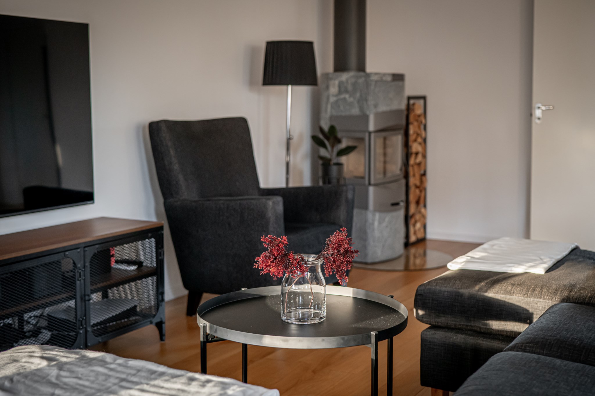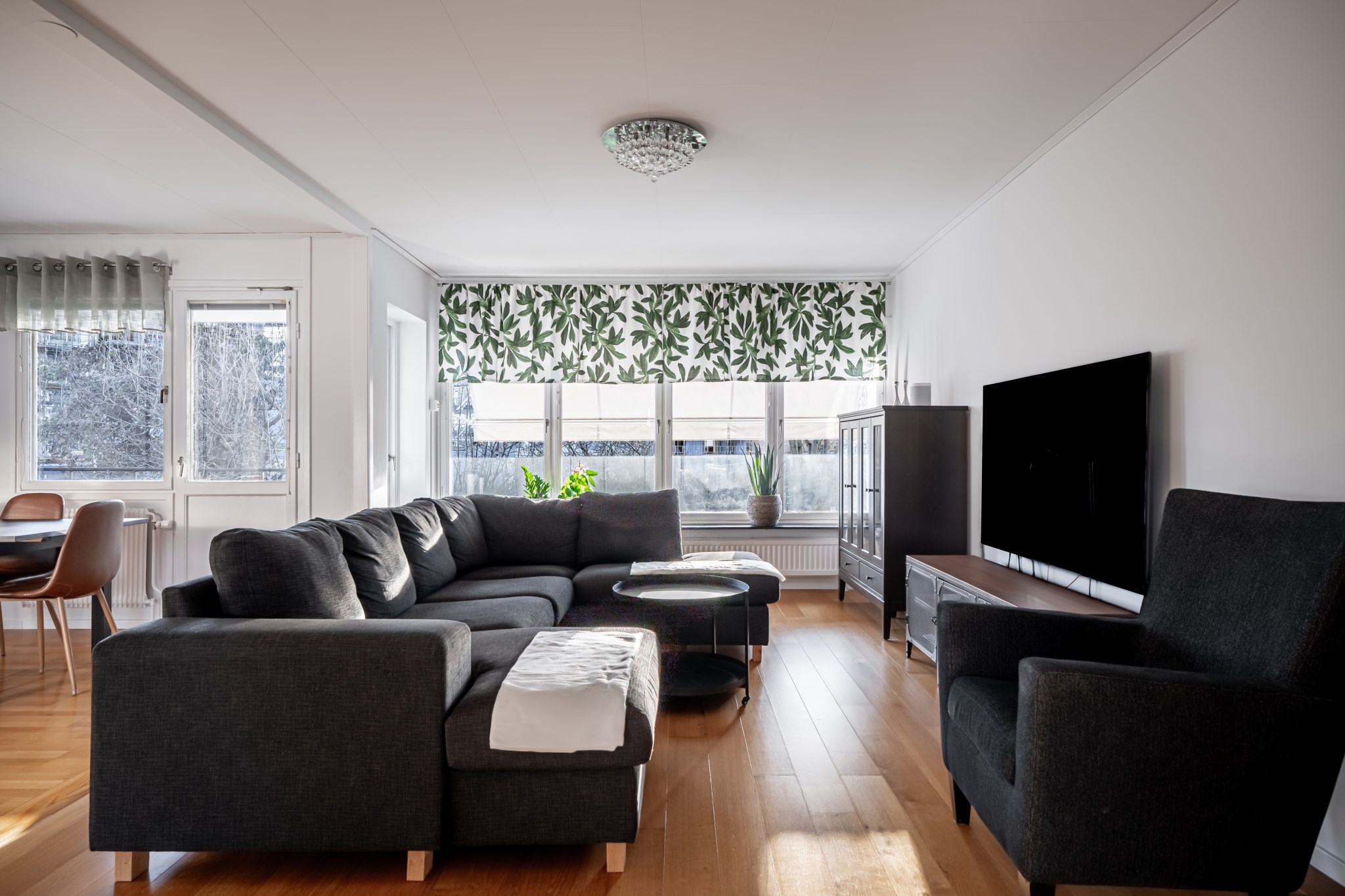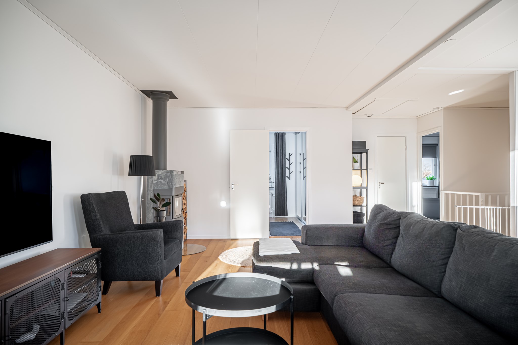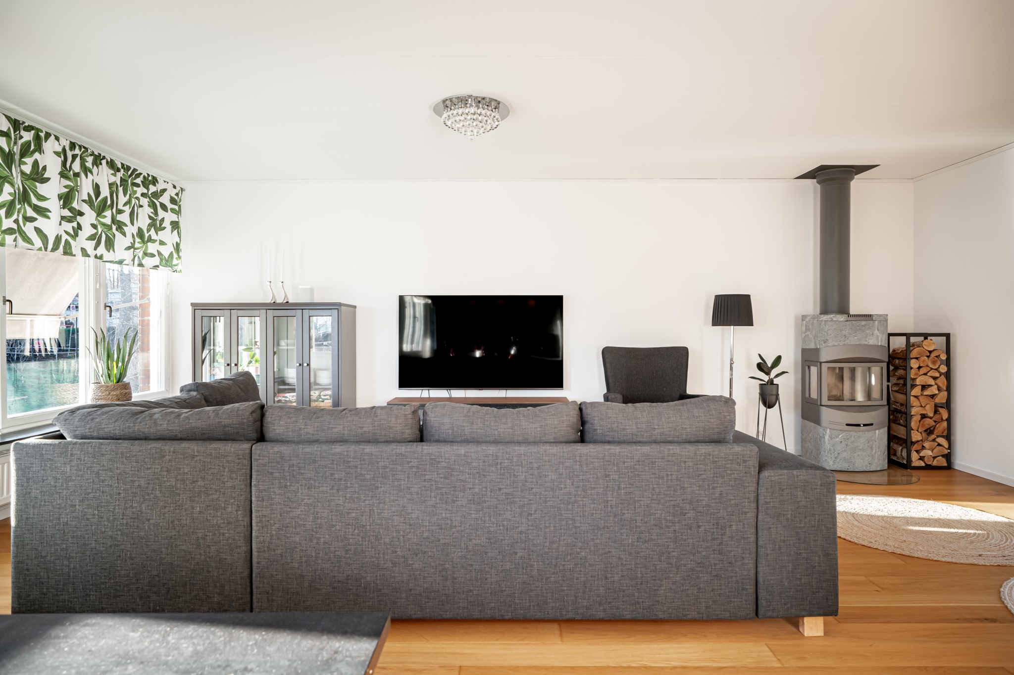 Trivsamt vardagsrum med stora fönsterpartier som ger ett fint ljusinsläpp. Här finns gott om yta för både soffgrupp och matplats. En stilren täljstenskamin ger extra värme och mysfaktor. Rummet har parkettgolv och en social planlösning som knyter ihop hemmet på ett naturligt sätt.